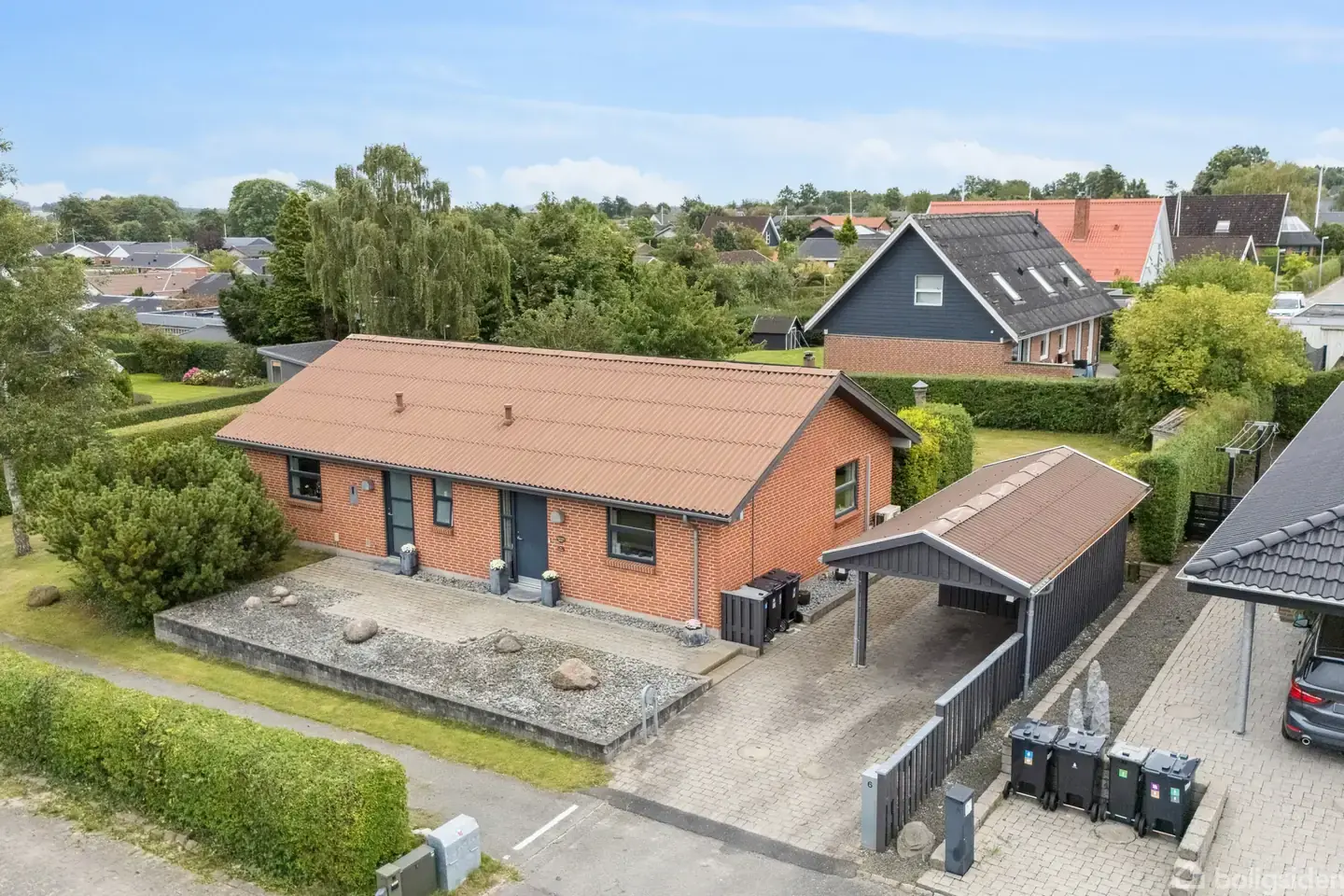 Flot, velholdt etplansvilla med rolig beliggenhed Det er på en lukket vej i rolige omgivelser i Over Romalt, at denne fine og velholdte villa er placeret. Huset fremtræder flot takket være løbende istandsættelser, og indenfor venter jer 109 veldisponerede kvadratmeter, som er godt indrettet. Velholdt villa med flot ydre og praktisk carport Allerede udefra fremtræder ejendommen flot med sin røde murstensfacade, der komplementeres af mørke vinduespartier og tag med solceller. Til huset hører d