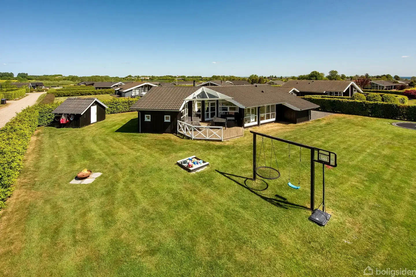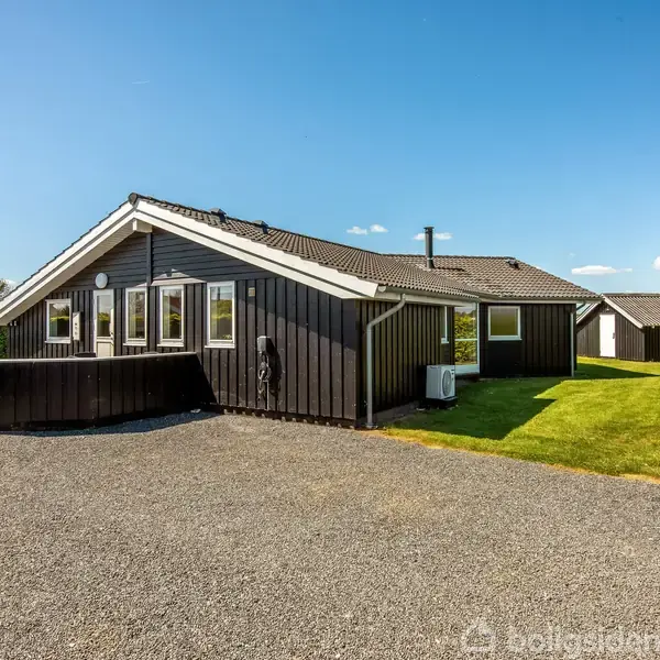 Investeringssommerhus - Flovt Strand. På Christian Jacobsens Vej 6 tilbyder vi dette flotte og velholdte Planetsommerhus - der er opført 2007. Sommerhuset er på 103 m2 og opført i sortmalet træværk med hvide vinduer og døre samt sort tagstenstag. Isoleret udhus på 9 m2 der er bygget i 2008. Sommerhuset opvarmes med elvarme, brændeovn og varmepumpe der kan tændes via mobilen. Indrettet med entre, soverum med 2 enkeltsenge, badeværelse med bruseniche og vaskemaskine, køkken med hvide skabe og