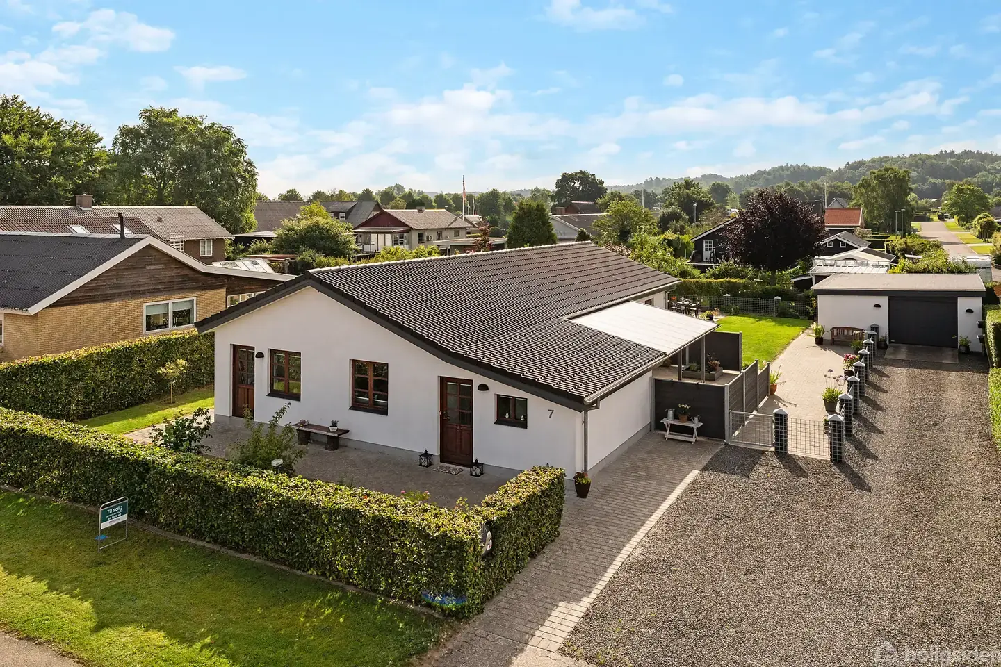 På Dahliavej 7 på det fredelige Sønderbro i Bjerringbro ligger denne charmerende etplansvilla på en lukket vej uden gennemkørende trafik. Et trygt sted at lande, uanset om I er førstegangskøbere, et par med små børn eller seniorer, der ønsker at bo mere enkelt og nært. Boligen byder på tre gode værelser med fleksible indretningsmuligheder; børneværelser, hjemmekontor eller gæsteværelse, alt efter jeres behov. Badeværelset er renoveret i 2021 og har både god plads og gulvvarme, som gør det ekstra