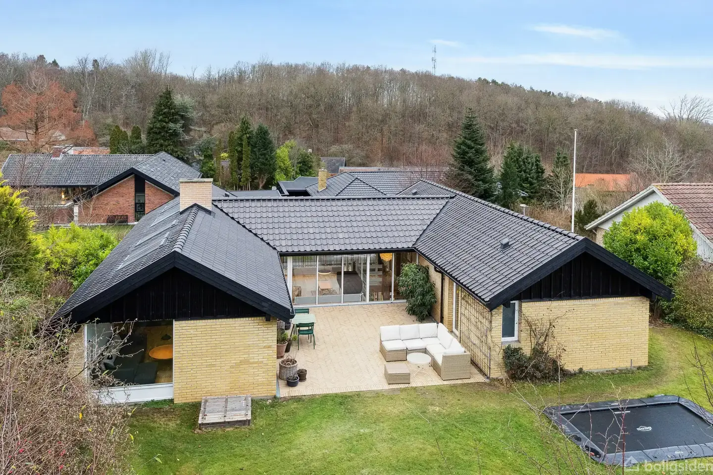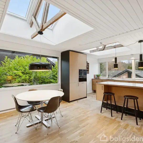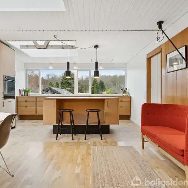 Det er arkitekten Bent Moudt, som står bag denne villa i Skåde Bakker. Huset er nøje tilpasset den skrånende grund, og fra den høje stueetage er der flot udsigt til trækronerne. Vejen er lukket og børnevenlig, og I har under 200 meter til skoven via nabolagets sti. Fra skoven kan turen fortsætte hele vejen til stranden, som nås på under 20 minutter. Plads er her rigeligt af, planløsningen er fantastisk, og lysindfaldet er noget ganske særligt.Ejendommen blev bygget i 1970, og den er fra 2023 og