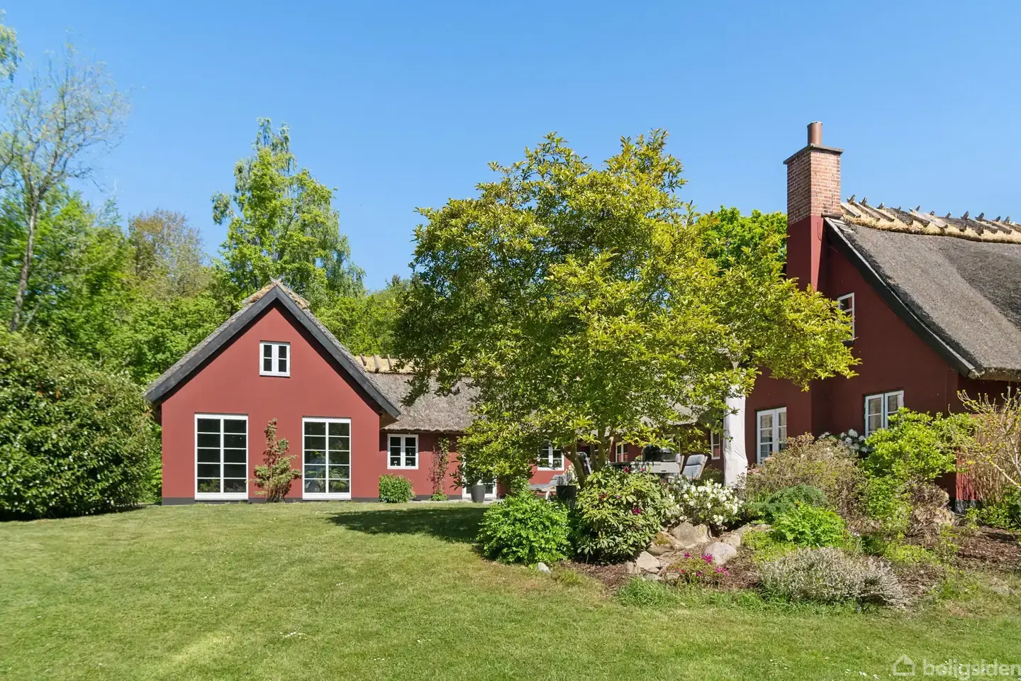 I Veksebo i Fredensborg placerer man sig centralt i det nordsjællandske landskab, mellem Hillerød og Helsingør og med hyggelige byer såsom Espergærde og Humlebæk inden for kort rækkevidde. Netop her ligger denne eksklusive landvilla, som lever op til de charmerende omgivelser. Boligen præsenterer sig med en facade i en dyb, rød tone, og som kronen på værket er der stråtag, som er nytækket flere steder.De halvmåneformede vinduer i kvistene og den grønne, udskårne hoveddør bidrager positivt til ud