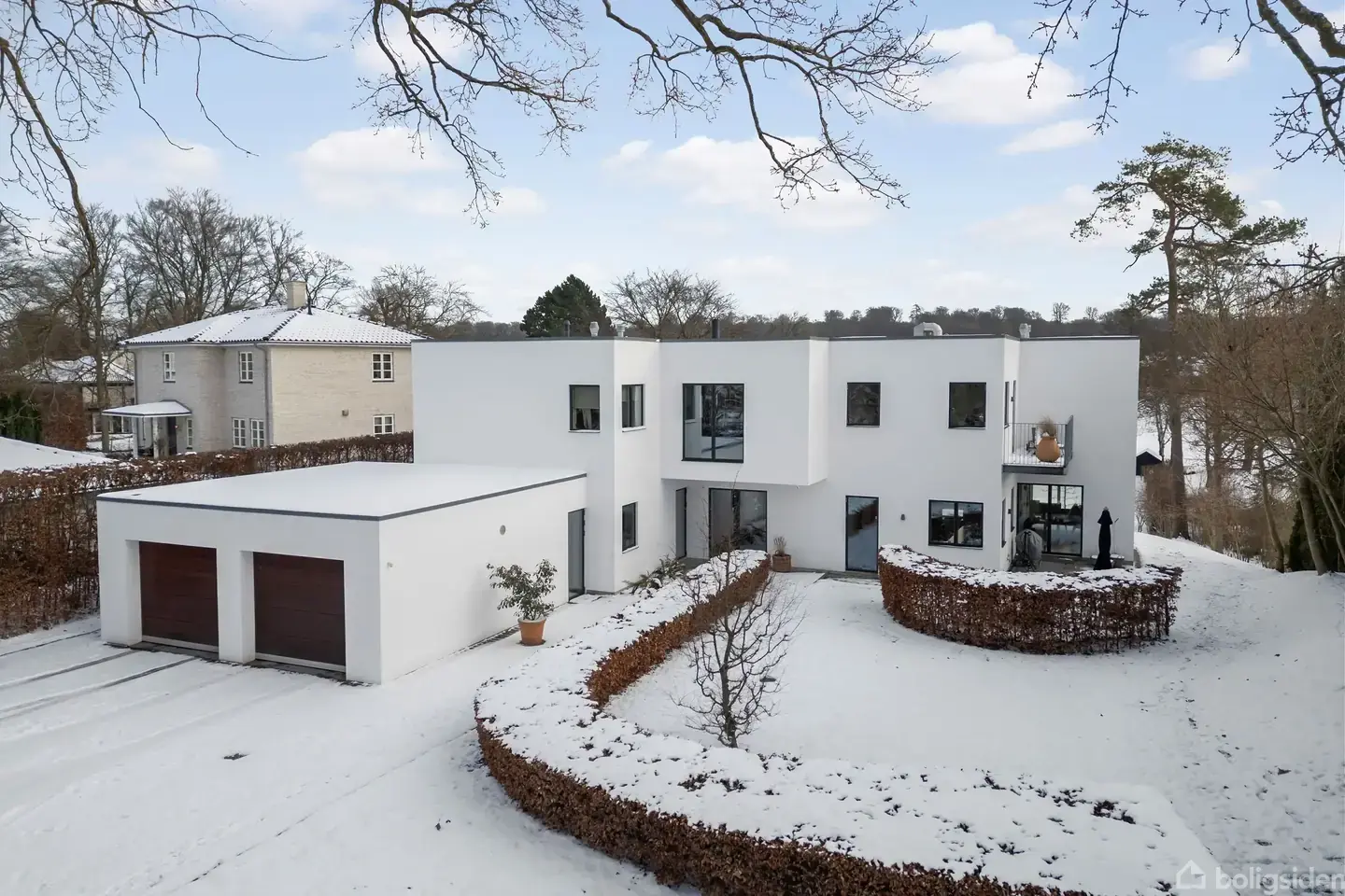 Åbent hus med tilmeldingskrav 8/3 - klik på billede - Flot arkitekttegnet funkisvilla højt beliggende med evigt inspirerende udsigt over Vejlesø placeret på en skøn, fredfyldt og yderst eksklusiv adresse. Opført i gedigne materialer og løbende vedligeholdt, således boligen fortsat fremstår som ny, lækker, indbydende, moderne og indflytningsklar. De Conincks Vej er en både hyggelig og eksklusiv villavej. Flot svungen vej og stort set ingen gennemkørende trafik. Store flotte villaer og en skøn skov/landlig stemning. Samtidig gåafstand til Holte S-tog Station, Holte Skole og masser af hyggeligt butiks- og caféliv ved Holte Midtpunkt. Kun 20 min. til København og midt imellem store gamle grønne skove, skønne søer og alskens natur- og fritidsaktiviteter. Et fantastisk centralt og alligevel fredfyldt og smukt sted at bo! Villaen ligger præsentabelt i svinget på De Conincks Vej med tilhørende grundstykker på begge sider af vejen. Dette giver en særlig eksklusiv fornemmelse og skøn ugeneret udsigt til begge sider af huset samt et areal med ekstra garage og parkering. Ankomst i imponerende hall, hvor man straks betages af den idylliske udsigt ud til Vejlesø. Kæmpe opholdsstue på næsten 70 kvm. med store dørpartier ud mod stor træterrasse, haven og søen. Åben forbindelse til lækkert snedkerkøkken med udgang til en hyggelig privat terrasse foran huset med aftensol om sommeren og en stemning af skov. Begge plan i huset giver en sublim og ugeneret oplevelse af sø og skov. En mageløs daglig oplevelse i sin egen bolig. Stueplan byder ydermere på stort kontor/bibliotek en suite til opholdsstuen samt afdeling med indgang fra hall’en til gæsteværelse, badeværelse, bryggers, vaskerum samt direkte udgang til den store dobbelte garage. Fantastisk flot repos rundt om 3/4 af trappeløbet ligesom de helt store gamle herskabsvillaer. Denne fordeles videre til udsigtsstue med udgang til pragtfuld altan med fantastisk udsigt over haven og søen. I den ene ende af 1. salen er der forældreafdeling med soveværelse, walk-in og stort eget badeværelse. Endvidere ekstra værelse, hvor små børn kan være tæt på, eller der kan indrettes fitnessrum/kontor. I den anden ende er der 3 børneværelser med eget badeværelse. Udenfor mod søen en flot parklignende have med fængslende udsigt. Dejlig rummelig træterrasse i niveau med stueplan og stor skrånende græsplæne ned til søen med egen badebro - perfekt til kajakker eller en båd til sejlture i Vejlesø og Furesø. Ydermere et lille udhus lige ved badebroen med mulighed for at lave en privat sauna ved søen. Dertil mange lækre og gennemtænkte valg: - En super planløsning med lys fra flere verdenshjørner i stort set alle rum - Flot loftshøjde i begge plan og skjulte akustiklofter i stuen og køkkenet - Smukke sildebensparketgulve og lækre naturklinker (Jura Grau Blau) - Snedkerkøkken, -bademøbler og -skabe indbygget i hele huset fra Søgaard snedkermøbler, der skaber en sammenhængende og tidløs oplevelse - Afdeling med vinkøleskabe i forlængelse af hall’en - Direkte indgang til villaen fra stor lukket garage med plads til to biler samt opbevaring - Eget indbygget alarm- og videoovervågningssystem - Gaggenau hvidevarer, Dornbracht armaturer samt BWT afkalkningsanlæg Der er mulighed for at kunne tilbygge yderligere ca. 300 m2. Ring for fremvisning på 21 70 00 11.