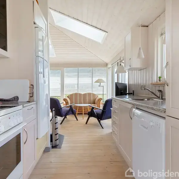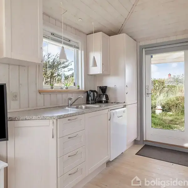 På Delfinvej 23 i Nørre Lyngby finder du et charmerende lille sommerhus, som byder på en unik kombination af nærhed til Vesterhavet og fredelig beliggenhed. Huset rummer 40 kvadratmeter fordelt på to værelser, køkken i åben forbindelse med stue og spiseplads samt en centralt placeret brændeovn, der skaber hygge på kølige dage. De store vinduespartier giver et flot lysindfald og lader naturen udenfor blive en del af oplevelsen indenfor. Sovepladserne er fordelt på et værelse med dobbeltseng og et værelse med en dobbeltseng med køje ovenover, hvilket giver ekstra fleksibilitet til både familie og gæster. Køjen fungerer samtidig som en praktisk opbevaringsplads til dyner, puder, kufferter og tasker, som man har behov for at have med i huset. Indretningen er enkel og funktionel, og huset har en behagelig atmosfære, hvor feriestemningen hurtigt indfinder sig. Udenfor får du glæde af en rummelig terrasse, der indbyder til afslapning og udeliv. Her kan du nyde solen, samle venner og familie til hyggelige måltider eller blot læne dig tilbage og mærke roen fra det naturskønne område. Sommerhuset ligger ugeneret for enden af en blind vej, og du har kun få minutters gang til stranden, hvor Vesterhavets brus og de brede sandstrande venter. Nørre Lyngby er kendt for sin storslåede natur og rolige atmosfære. Her er der plads til at finde ro, samtidig med at Løkkens butikker, caféer og byliv ligger inden for kort køreafstand. Med dette sommerhus får du en skøn base, hvor du kan skabe rammerne for mange års ferieminder tæt på havet.