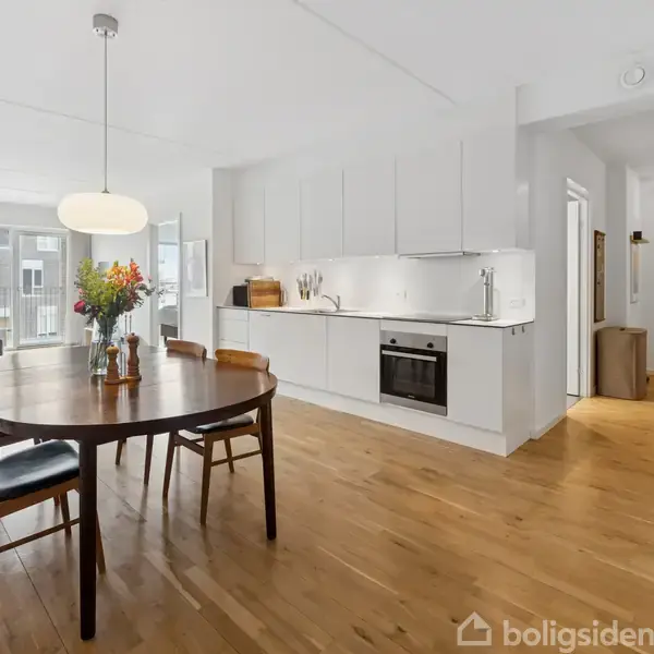 I skal kigge mod Teglholmens kanaler, for her udbyder vi en gennemført og indbydende lejlighed til salg. Her venter vandkig fra altanen, havnebade lige om hjørnet og alt det, der får hverdagen til at glide helt tæt på. Indendøre mødes I af en gennemtænkt planløsning og et generøst lysindfald, der giver boligen en let og åben fornemmelse. Den rummelige entré leder naturligt videre ind i det store alrum, hvor der er plads til at indrette både spise- og opholdszoner. Det stilrene HTH-køkken er el