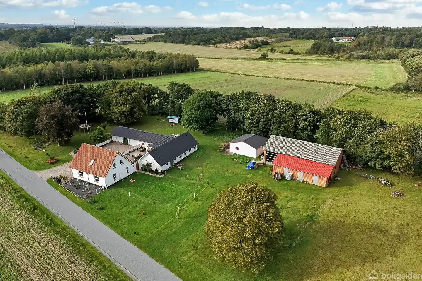 Velkommen til denne charmerende landejendom, der rummer et utal af muligheder for de rigtige købere. Hovedhuset har et boligareal på 130m² og blev opført i 1950. Ejendommen byder udover stuehuset på en stålhal der pt. er indrettet med savværk,, en løsdriftsstald samt yderligere to udbygninger der er indrettet med blandt andet en rummelig gildesal, værksted, garage og bryggers. Hovedhuset er indrettet med fokus på dagligdags-funktionalitet og komfort. Entréen byder jer velkommen, og herfra er der adgang til enten køkkenet eller badeværelset. Det store køkken giver rig mulighed for både at etablere spisekøkken, eller bare have god plads til kreative kulinariske udfoldelser. Fra køkkenet er der desuden adgang til den lille installationskælder. Badeværelset er velindrettet og har ligesom resten af stueplan i hovedhuset gulvvarme. Stuen er meget rummelig og her er der desuden opgang til husets 1.sal hvor I finder tre gode værelser samt en stor repos, der kan anvendes som kontor eller ekstra opholdsrum. Ejendommen fremstår generelt pæn, anvendelig og uden I skal bekymre jer om asbesttage. Tagene er nemlig skiftet på både hovedhus og udbygningerne. Den fantastiske grund omkring huset giver rig mulighed for dyrehold, egen dyrkning eller produktion af forskellige slags. For naturelskere byder ejendommen også på et dejligt fredskovsareal med et rigt og alsidigt dyreliv – et sandt paradis for jægere, eller de der blot vil gå en tur på egen jord og nyde dyrelivet. Agerjorden er pt. forpagtet ud til dygtige lokale hvilket man kan vælge at fortsætte med, hvis man ikke selv ønsker at dyrke jorden. Derudover er der lagt tilbud på køb af en stor andel af jorden der hører til ejendommen, hvis man ikke selv ønsker det. Dette kan I høre mere om ved at ringe til os. Ejendommen er beliggende lige udenfor Give og kombinerer dermed roen fra livet på landet med nærheden til større byer og motorvejsnettet, hvilket gør dagligdagslogistik let håndterbar uden at gå på kompromis med freden på landet.