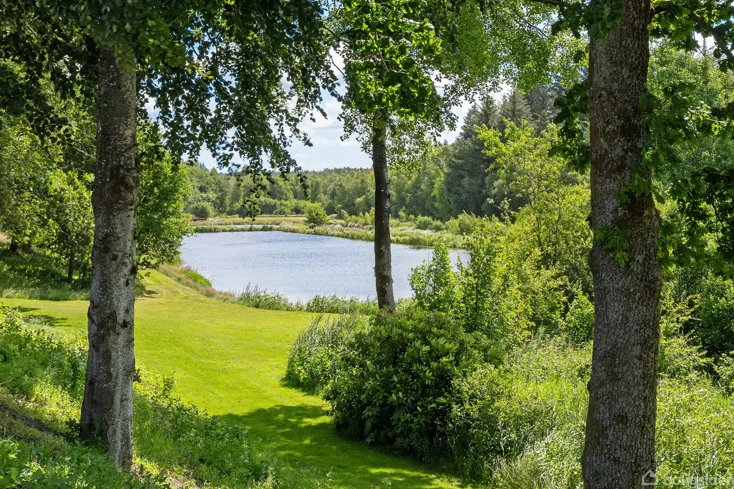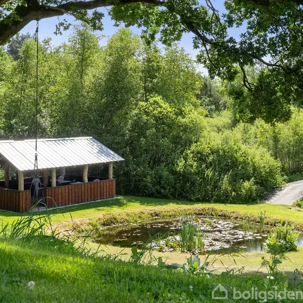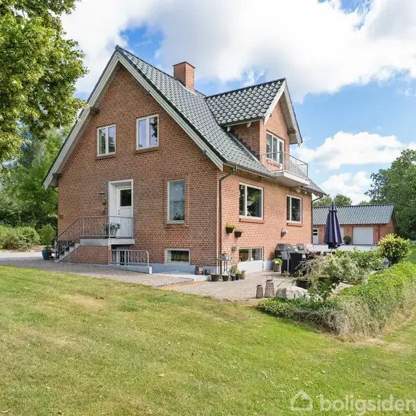 Holtum Å snor sig ikke bare ved siden af ejendommen, men gennem haven. Naturlandskabet strækker sig vidt og bredt, og resultatet er et mageløst syn fra denne klassiske rødstensvilla, der ligger smukt placeret midt i det hele. Boligen besidder flere originale træk, og så har den en funktionel indretning med opholdsmiljøet i stueplan og værelsesafdelingen på første sal. Der er desuden en række anvendelige udbygninger med blandt andet en rummelig garage, og endelig er den markante grund en af de ma