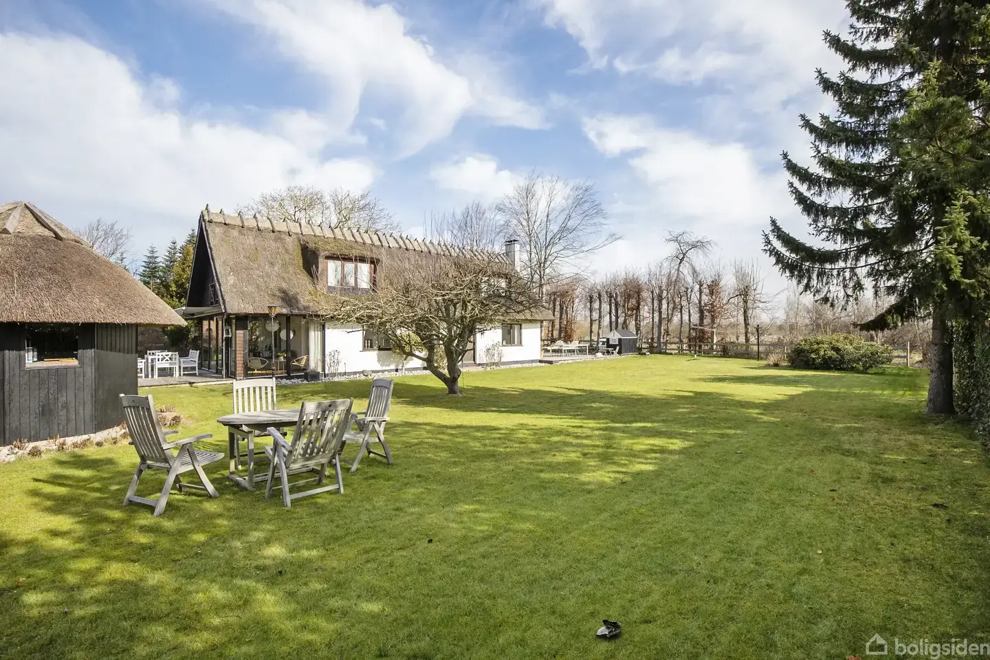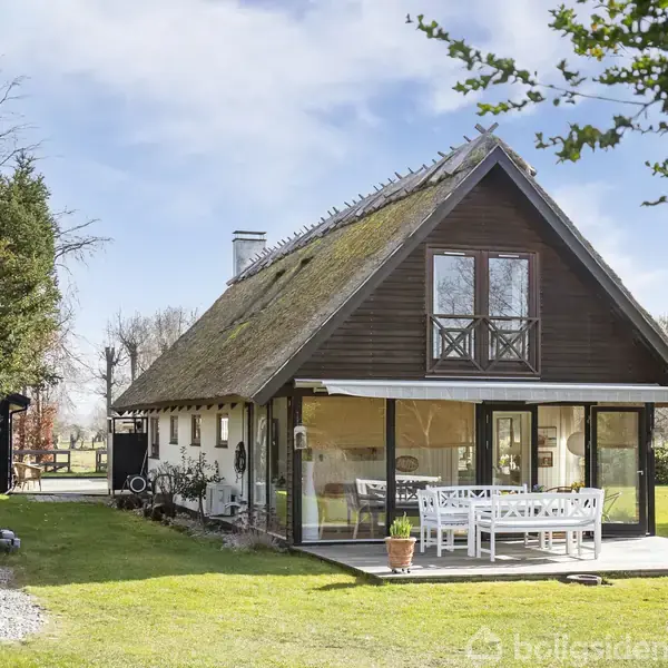 Et sommerhuseventyr i to plan – stråtag, franske altaner og marker som nabo Et sommerhus som taget ud af en fortælling Der findes sommerhuse… og så findes der sommerhuse, der føles som en hel stemning. Et sted, hvor roen rammer én allerede ved første blik, og hvor skuldrene automatisk sænker sig, fordi her er plads til nærvær, tid og det gode liv. Dr Louisesvej 30 er netop sådan et sted. Et stråtækt sommerhus, der med sin hvidmalede facade, brune vinduer og smukt svungne stråtag leder tankerne