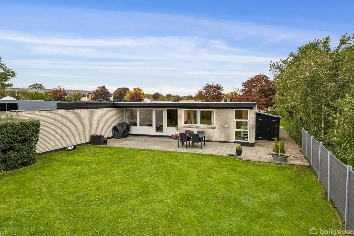 For enden af en lukket stikvej, med grønne stier omkring og alle hverdagens fornødenheder inden for kort rækkevidde, finder I dette indbydende og velholdte rækkehus, hvis 112 velfungerende kvm kommer til at danne skønne rammer om tilværelsen. Dejligt roligt - og alligevel ganske centralt i Snejbjerg. Velkommen til. Lyse sten og brede vinduer venter på den anden side af hækken, hvor den nyanlagte fliseindkørsel giver god plads til både jeres og gæsters biler. Endnu mere praktik finder I i redska