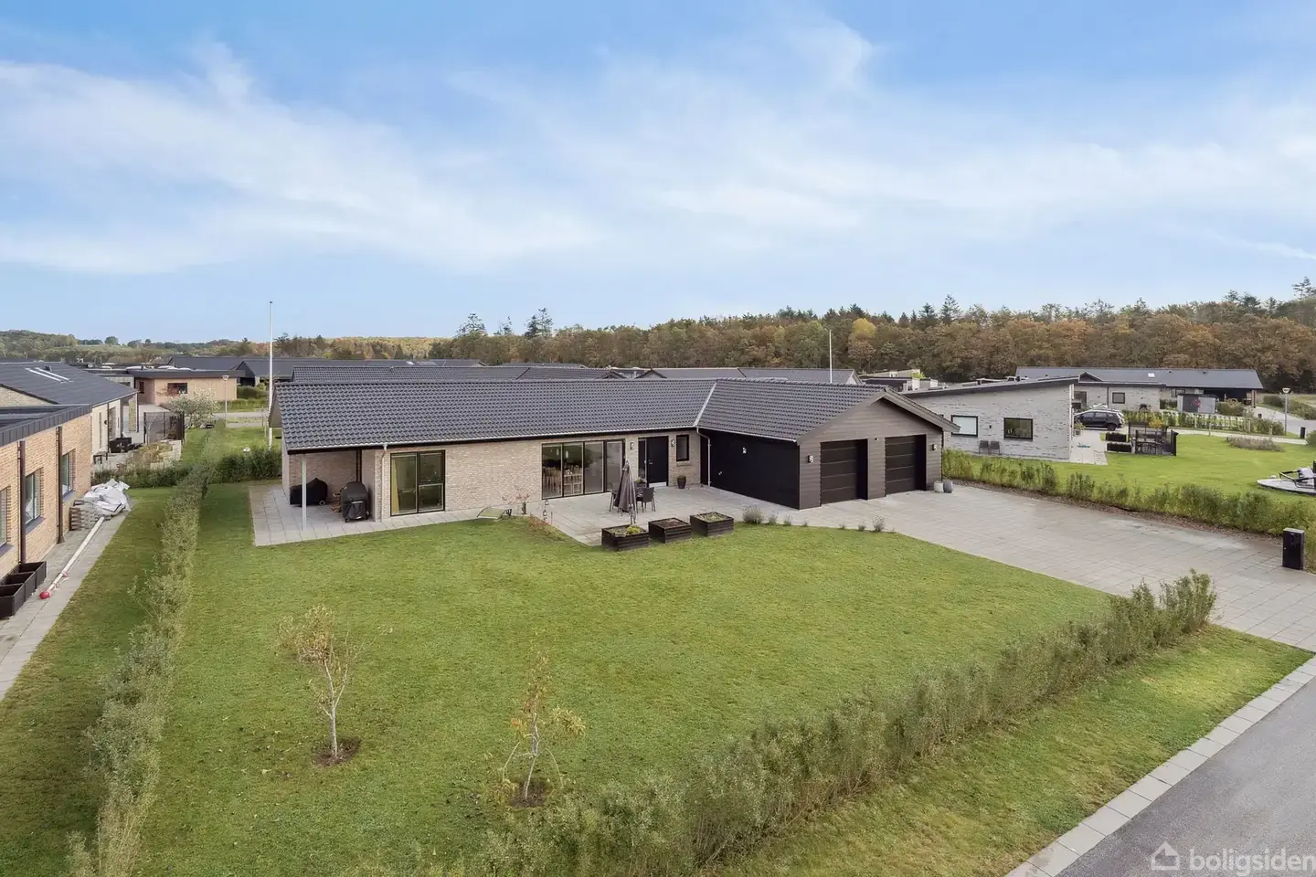 Nyopført kvalitetsvilla med moderne komfort og fredelig beliggenhed i attraktive Arnbjerg Denne energivenlige villa fra 2022 byder på 170 m² fordelt på 5 værelser, hvilket giver rig mulighed for både familieliv, hjemmearbejde og gæsteværelser. Boligen er opført med moderne materialer og gennemtænkt planløsning, hvor køkken-alrum og stue ligger i åben forbindelse og skaber et naturligt samlingspunkt. De store vinduespartier sikrer et flot lysindfald og giver udsigt til haven, mens de lyse gulve og vægge understreger boligens rummelighed. Køkkenet er stilrent med god bordplads, integrerede hårde hvidevarer og direkte adgang til terrasse. Badeværelserne er moderne og velindrettede med kvalitetsmaterialer, og der er både gæstetoilet og stort badeværelse med bruseniche. Bryggerset har separat indgang og er praktisk indrettet med vaskefaciliteter og opbevaringsplads - ideelt til hverdagens gøremål. Grunden er på 832 m² og byder på en velanlagt have med god plads til både leg, afslapning og havedrømme. Der er etableret terrassemiljøer, hvor solen kan nydes fra morgen til aften, og haven er nem at vedligeholde. Ejendommen har en rummelig dobbeltgarage, som giver god plads til både biler og opbevaring. Inde i garagen findes et separat rum indrettet som et lille værksted - perfekt til hobbyprojekter, reparationer eller opbevaring af værktøj. Dunhammeren ligger i Arnbjerg, et moderne og attraktivt boligområde i Viborgs vestlige del. Du bor tæt på skole, daginstitutioner, indkøb og grønne områder, og der er gode stisystemer til både gå- og cykelture. Offentlig transport og nem adgang til Viborg centrum gør hverdagen fleksibel og bekvem. Dunhammeren 20 er en moderne og indflytningsklar villa med god plads, funktionelle løsninger og en beliggenhed, der kombinerer natur og nærhed til byen. Kontakt os for en fremvisning - og oplev boligen og området med egne øjne.