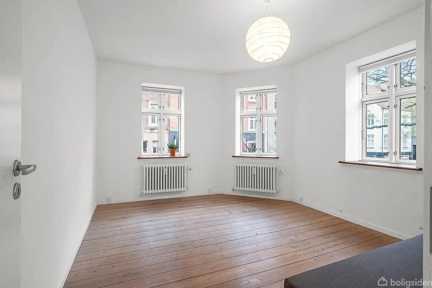 Hyggelig 3-værelses ejerlejlighed midt på Jægergårdsgade med en privat tagterrasse Velkommen til det centrale Frederiksbjerg. Her bor du i en af Aarhus’ mest eftertragtede gader, hvor caféer, små specialbutikker, vinbarer og populære restauranter ligger som perler på en snor. Gaden summer af liv og stemning, og du har alting lige uden for din hoveddør.Lejligheden ligger som en høj stuelejlighed, hævet godt over gadeplan, så du både får privatliv og et skønt kig op og ned ad gaden. Under lejlighe