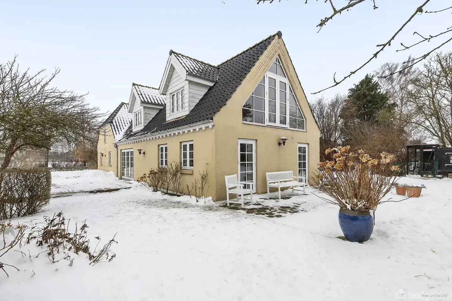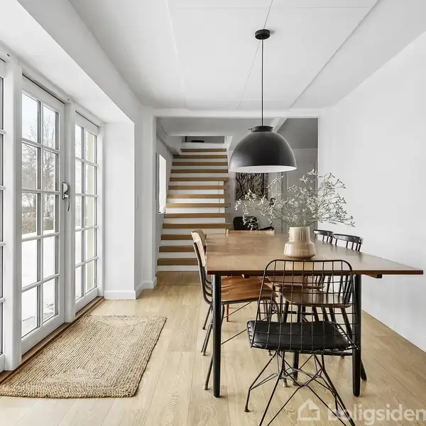 I får nærmest følelsen af at være ankommet til et lille idyllisk landsted, når I triller bilen ind på matriklen her på Dyngby Møllevej 21 – lige under to kilometer fra områdets fredelige og børnevenlige badestrand. Her er ro og rum til at geare ned, få jord under neglene og bare nyde havens hyggelige miljø med frugttræer, bålplads og muligheden for at holde høns. Indvendigt er boligen flot moderniseret af tidligere ejer, og indretningen er dynamisk med gode, lyse rum og en dejlig udsigt til vand