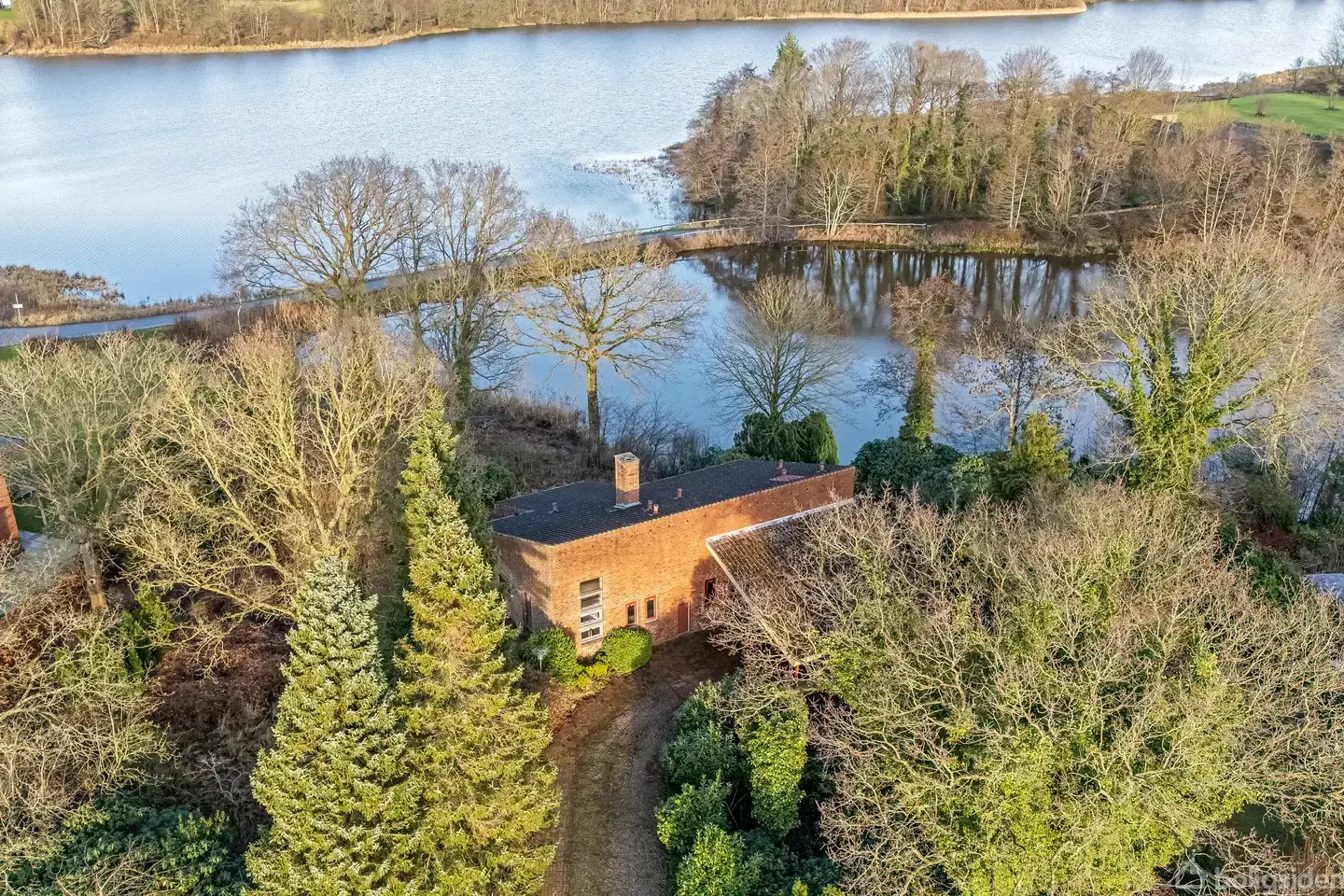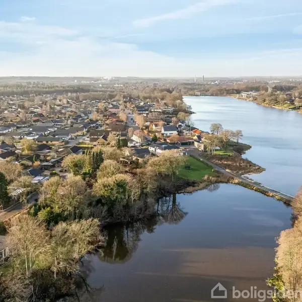 Unik arkitekttegnet ejendom med grund mod Uhresø.Beliggenheden er super god og byder på:- udsigt over såvel Uhresø og Vandkraftsøen.- gåafstand til flot natur omkring søerne og Storåen.- lukket stikvej.- gå-/cykelafstand til skole, indkøb, idrætshal, vuggestue og børnehave.Boligen er indrettet med indgangsparti med særskilt adgang til bryggers og entre. Entréen er samtidig fordelingsgang med trappe til kælder og adgang til gæstetoilet, soveværelse med kig til søerne, udgang til altan og badevære