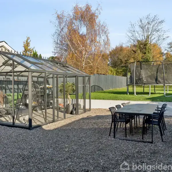 Indflytningsklar og moderne villa med skøn solrig baghave med orangeri