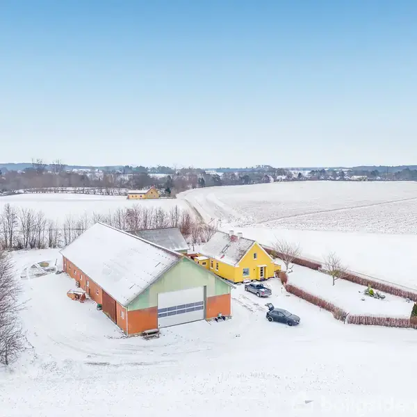 Rummelig landejendom med bolig i to plan, stor gildesal og maskinhal.