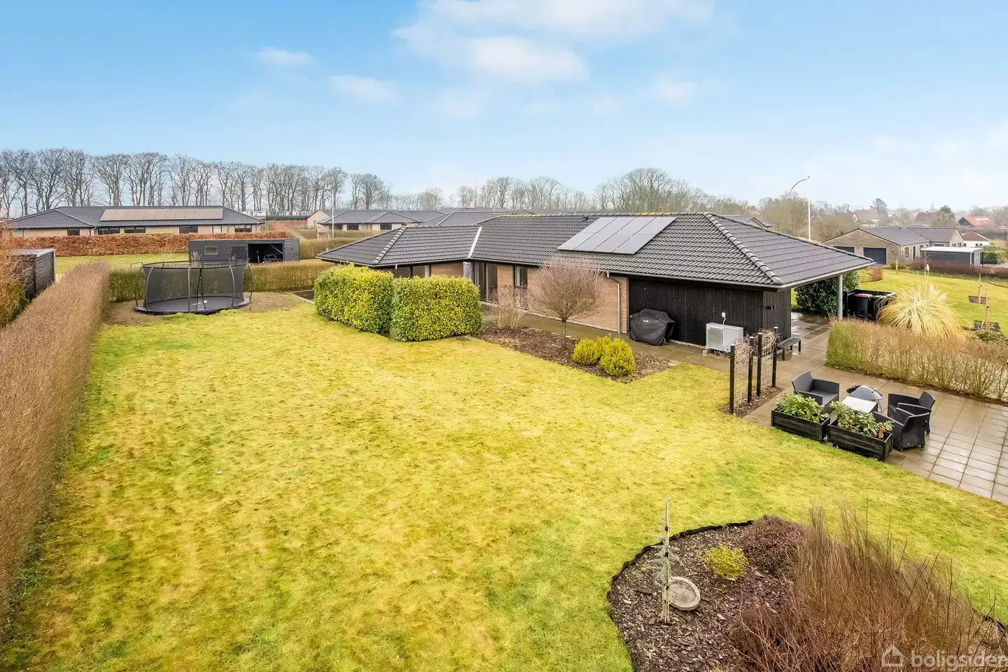 Ejsbølhøj 5, er en moderne og indflytningsklar villa, hvor energivenlige løsninger og gennemtænkt planløsning går hånd i hånd med en rolig og familievenlig beliggenhed. Her får I en stilren bolig med et lavt energiforbrug, solceller på taget og komfort i hverdagen – både ude og inde.Boligen byder velkommen via entréen, som ligger i direkte forbindelse med bryggers. Bryggerset har egen indgang og god plads til vaskefaciliteter samt opbevaring, hvilket giver en praktisk og velfungerende hverdag. P