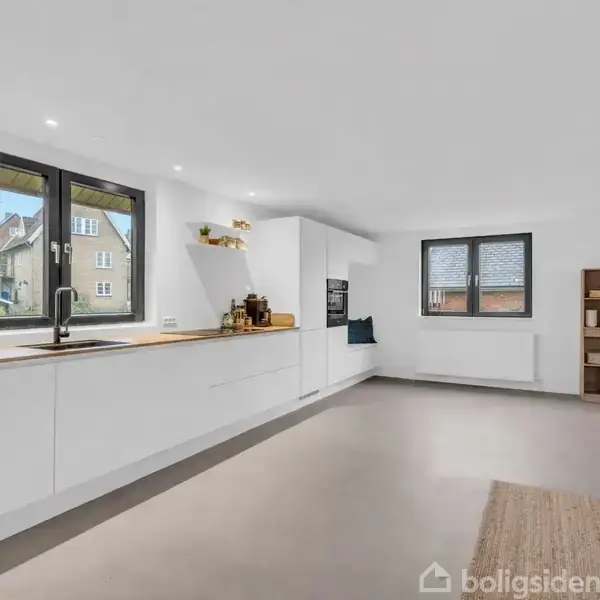Boligen er gennemgående renoveret med fokus på nutidig komfort, funktionalitet og et stilrent udtryk. Med fire gode værelser og et lyst, rummeligt badeværelse er her plads til både familieliv, hjemmekontor og gæsteværelse.Hjemmets hjerte er den store stue i åben forbindelse med køkkenet, hvor de brede vinduespartier lader lyset strømme ind og skaber en åben og indbydende atmosfære. Her er der plads til både hverdagshygge og samvær med venner og familie.Det moderne køkken er indrettet med lækre m