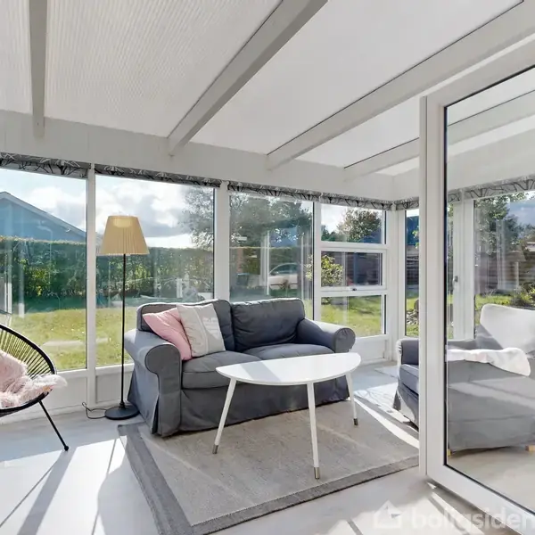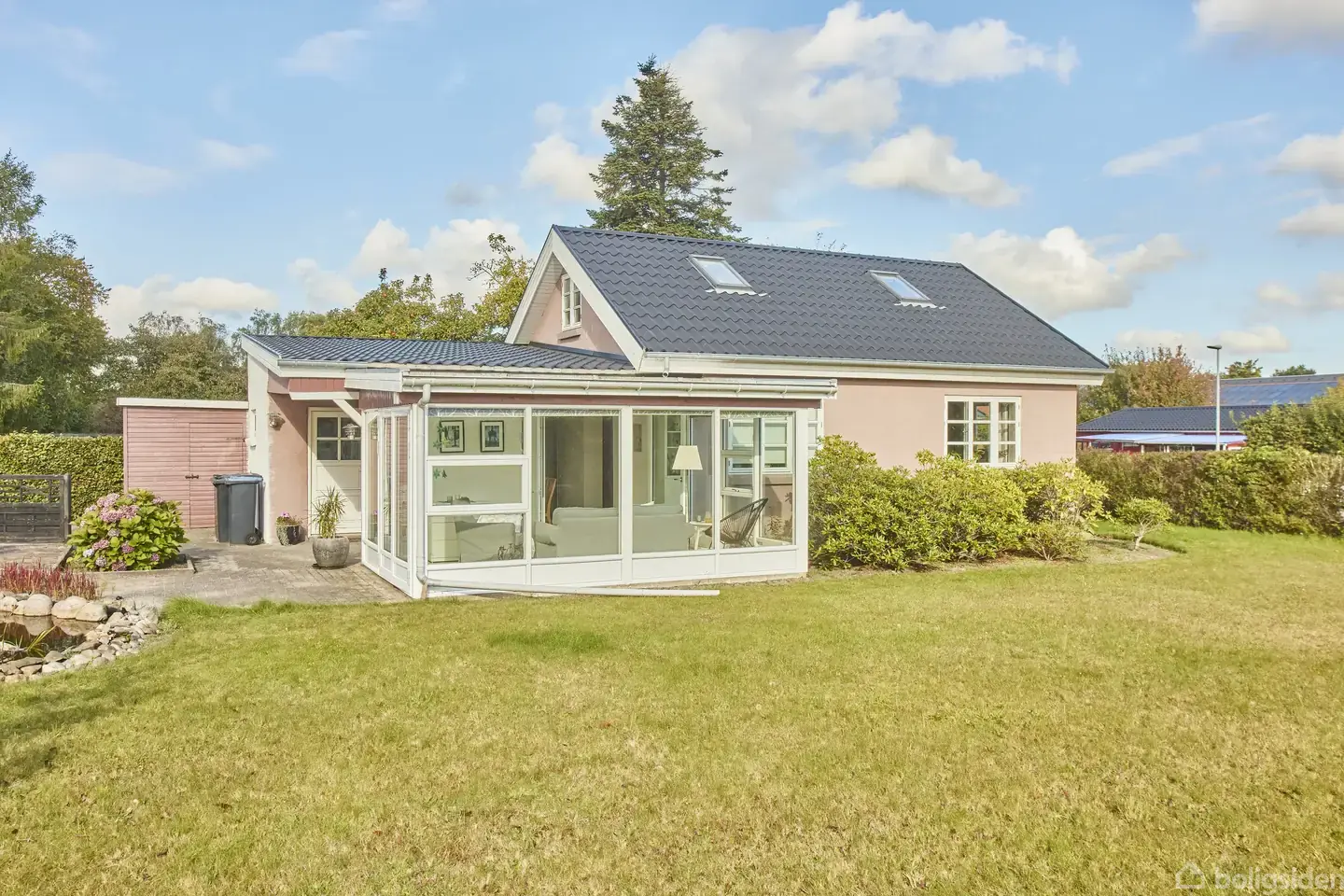 Denne charmerende villa på 90 m² byder på en funktionel planløsning og en attraktiv beliggenhed i et stille boligområde. Allerede ved ankomsten møder man en indbydende facade og en stor glasveranda, der åbner ud mod haven. Herfra er der frit udsyn til den grønne grund på 744 m² med en stemningsfuld dam – et oplagt samlingspunkt til udeliv, leg og afslapning.Indvendigt er boligen indrettet med en entré, der fører videre til et lyst alrum, køkken og en rummelig stue med godt sammenhængende opholds