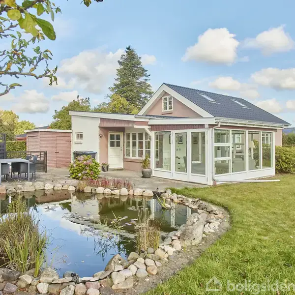 Villa med glasveranda, funktionel planløsning, rummelig have med dam og terrasse