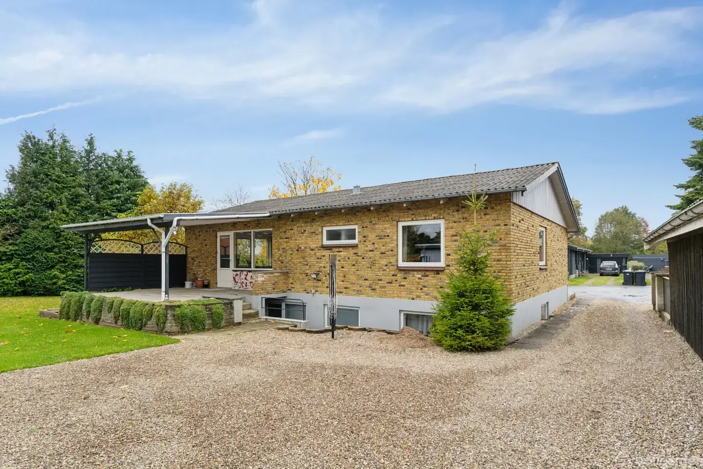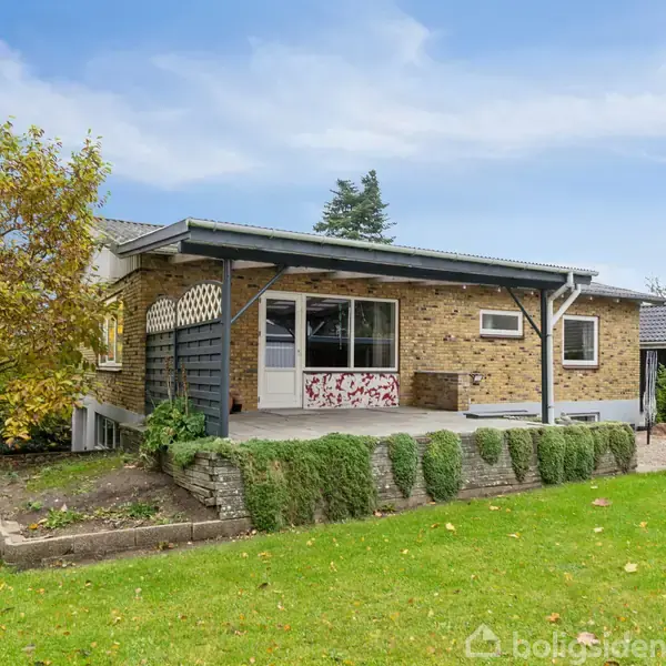 Villa 112 m², 2 værelser, 1.057 m² privat grund, kælder 112 m² og carport Villa på hele 224 etagemeter med 2 værelser og direkte adgang til en overdækket terrasse på en privat grund på 1.057 m². Opført i 1965 fremstår ejendommen i gul mursten med et enkelt, velholdt udtryk, og den brede indkørsel med carport giver praktisk parkering. Kælderen tilføjer yderligere 112 m², så huset kombinerer et overskueligt stueplan med reel plads under terræn til værksted eller opbevaring. Indretningen byder på