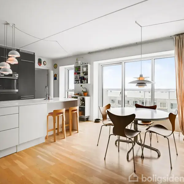 Velkommen til en lys og rummelig ejerlejlighed på 107 m², hvor moderne komfort, gennemtænkt planløsning og en enestående beliggenhed forenes i en bolig, der både er funktionel og indbydende. Lejligheden ligger højt i et byggeri fra 2014 og rummer fire værelser samt to altaner, og allerede ved første skridt indenfor mærkes den behagelige atmosfære, som skabes af det generøse lysindfald og den åbne udsigt over de vidtstrakte naturområder ved Kalvebod Fælled. De store vinduespartier mod øst og syd
