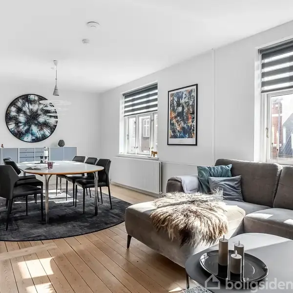 En sjælden stor og velindrettet lejlighed i to plan med masser af værelser og en yderst attraktiv beliggenhed tæt på byliv, grønne områder og lystbådehavnen. Her bor du roligt og centralt med kort afstand til strøget med mange velkendte butikker, rigt caféliv, indkøb, sportsfaciliteter, skole, børnepasning samt alle de årlige aktiviteter midtbyen tilbyder. Samtidig er der nem adgang til banegården samt motorvej E45. Lejligheden fremstår indflytningsklar og er løbende vedligeholdt og moderniseret. Den store og lyse stue fungerer som hjemmets naturlige samlingspunkt med flot lysindfald og plads til både spisebord og sofaarrangement. Planløsningen er gennemtænkt og fleksibel med mulighed for både familieliv, hjemmearbejde og gæstepladser. I stueplan finder du entré, stue, et lyst og funktionelt køkken med integrerede hvidevarer samt et stort og renoveret badeværelse. På førstesalen ligger et gæstetoilet, et stort soveværelse samt tre ekstra værelser, som nemt kan bruges til børneværelser, kontor eller hobbyrum. Til lejligheden hører egen carport, som er en sjælden fordel i midtbyen. Derudover får du et stort kælderrum på cirka 15 kvadratmeter, samt adgang til en fælles, vestvendt terrasse med hyggelig have. En bolig med sjældent mange værelser samt egen carport, kombineret med ro og nærhed til byen på bedste vis - til en attraktiv pris !