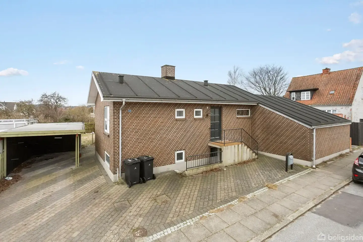 Tæt på byens centrum og beliggende på en 460 m² overskuelig grund med en nem, lille have finder I denne rummelige villa, der i særlig grad henvender sig til den pladskrævende familie. Ejendommen byder på et samlet etageareal på 268 m², fordelt på 148 m² boligareal samt 120 m² kælderareal med mange anvendelsesmuligheder. Villaen fremstår med listetækket paptag, hvide trævinduer og en moccafarvet facade. På grunden findes desuden en saneringsmoden carport med tilhørende udhus. Boligen indeholder et køkken med god spiseplads i delvis åben forbindelse til opholdsstuen. Opholdsstuen har udgang til både en hævet sydøstvendt og en hævet sydvestvendt træterrasse, hvor solen kan nydes fra morgen til aften. Herudover rummer boligen et nedsænket børne- eller soveværelse med udgang til en flisebelagt terrasse i niveau, to børneværelser, et soveværelse samt et badeværelse med bruseniche og sammenklappelige låger. Dertil kommer et gæstetoilet med klinkegulv og en entré med nedgang til kælderen. Kælderen, som ikke er boligareal, indeholder et badeværelse med bruseniche og klinkegulv, et toilet ligeledes med klinkegulv, tre disponible rum samt en rummelig gildesal eller aktivitetsrum med klinkegulv. Herudover findes en fordelingsgang med klinkegulv og udgang til kælderhals. Har I behov for hurtig indflytning, er der mulighed for en hurtig overtagelse.