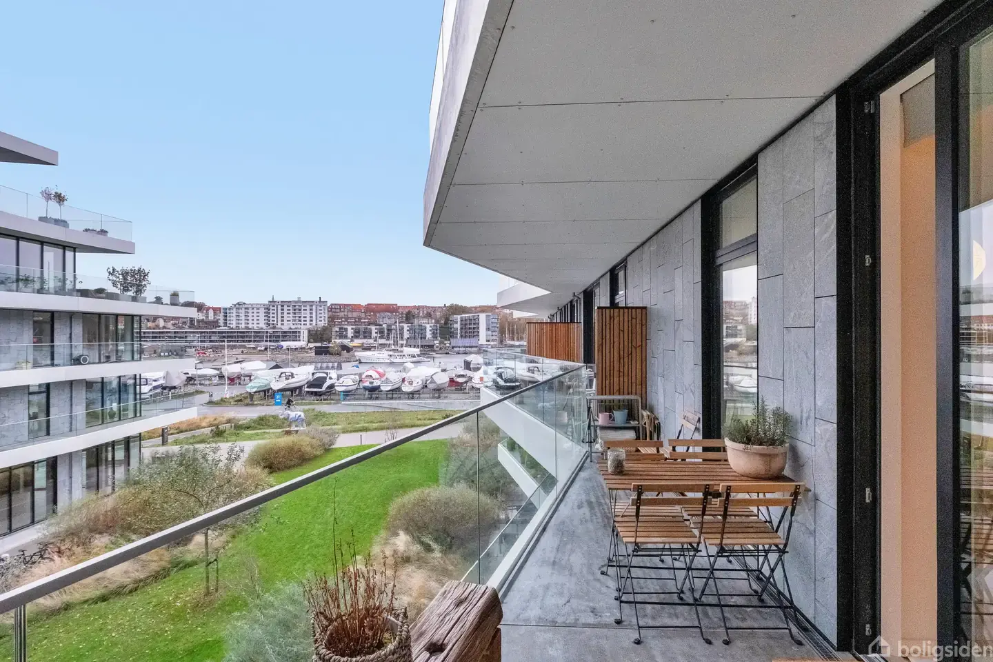 Beliggenheden:SHIP ligger på den yderste, indvendige del af Aarhus Ø. Du er nærmeste nabo til lystbådehavnen mod vest og har Aarhusbugten mod nordøst. Ejendommens placering er unik i forhold til at få det bedste af alting! Fra altanerne der flankerer begge sider af boligen, er der udsigt til lystbådehavnen og Riis Skovens smukke bøgefauna. Indretning: Fra den elegante trappeopgang med elevator, bydes du velkommen i en entré med god garderobeplads og adgang til gæstebadeværelset. Boligen har e
