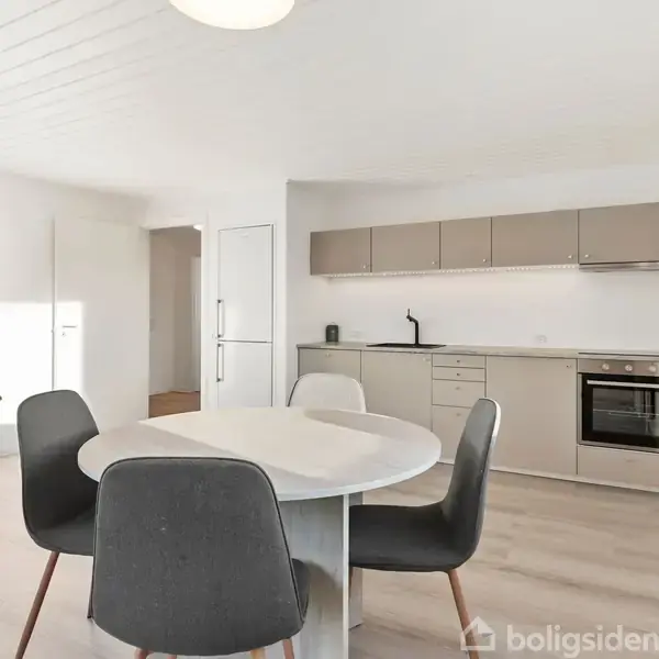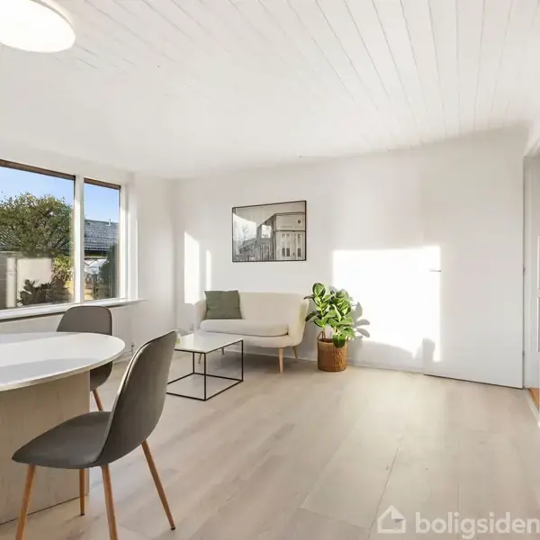 OMRÅDET:Rækkehuset har en attraktiv beliggenhed – perfekt hvis du ønsker fred og ro, samtidig med at byen og dens faciliteter er inden for rækkevidde. Der er endvidere kort afstand til både skole og indkøb, hvilket gør hverdagen nem og overkommelig. EJENDOMMEN:Enderækkehuset er opført i ét plan uden trapper, hvilket er praktisk og komfortabelt for både par, seniorer og dem, der ønsker en boligløsning med lav vedligeholdelse. Rækkehuset er en del af en mindre ejerforening, hvor der er styr på tingene og meget lave ejerudgifter.Boligen er placeret længst væk fra vejen og byder derfor på maksimalt privatliv. Hertil kommer en lukket sydvendt have, hvor solens stråler kan nydes året igennem. Til ejendommen hører desuden carport med udhus, opført i 2004. INDRETNINGEN:Boligen er i 2025 blevet markant moderniseret indvendigt af nuværende ejer og står fuldstændig indflytningsklar. Der er etableret et ekstra værelse, så boligen nu byder på to separate soverum samt et skønt og lyst køkken-alrum. Man ankommer via en rummelig entré med plads til overtøj, og herfra er der adgang til et flot, lyst og nyrenoveret badeværelse med god bruseplads samt vaskefaciliteter.Til venstre finder vi boligens første værelse, som er perfekt som børneværelse eller hjemmekontor. Videre herfra kommer man til det flotte køkken-alrum, hvor der venter et gennemført og særdeles funktionelt køkken med alt i hårde hvidevarer.Alrummet giver rig mulighed for både spise- og sofaafdeling og har direkte udgang til en stor stenbelagt terrasse mod syd. Til sidst finder vi boligens primære soveværelse, som – udover god plads – også byder på indbyggede skabe for maksimal udnyttelse. Alt i alt en flot renoveret bolig, der er maksimalt optimeret i forhold til plads og indretning.