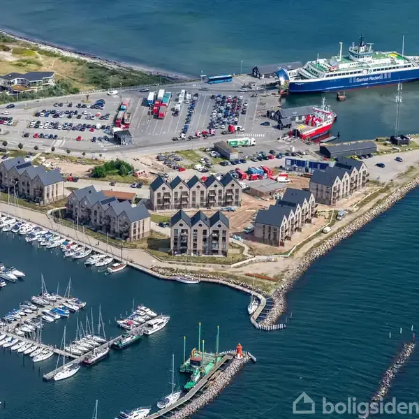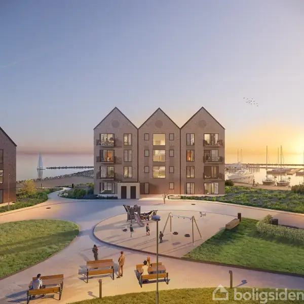 Fotos er fra prøveboligen Velkommen til Færgebyen – Gennemlyst lejlighed med panoramaudsigt fra alle rum Denne gennemlyste lejlighed på 99 kvm kombinerer moderne komfort med en udsigt, der tager pusten fra dig. Fra alle rum har du panoramaudsigt over vandet, som skaber en helt særlig atmosfære, der drager dig fra det øjeblik, du træder ind. Boligen byder velkommen i en lys entré med god opbevaringsplads og vaskefaciliteter. Herfra ledes du videre ind i boligens hjerterum – det store, åbne køk