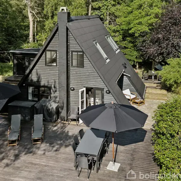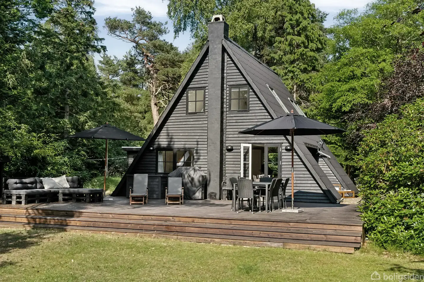 Et stilrent, sort A-hus med træfacade troner diskret mellem træerne og fremstår som et moderne bud på mødet mellem nordisk minimalisme og klassisk sommerhusstemning. Den mørke facade falder i ét med den grønne natur, mens det lyse interiør tilfører hygge og idyl. Det er et sommerhus med karakter, hvor arkitektur og omgivelser går hånd i hånd. Sommerhuset ligger i det attraktive Øster Lyng-område med egen udgang til skoven, få minutters gang fra den skønne sandstrand ved Lynghusvej. Her breder R