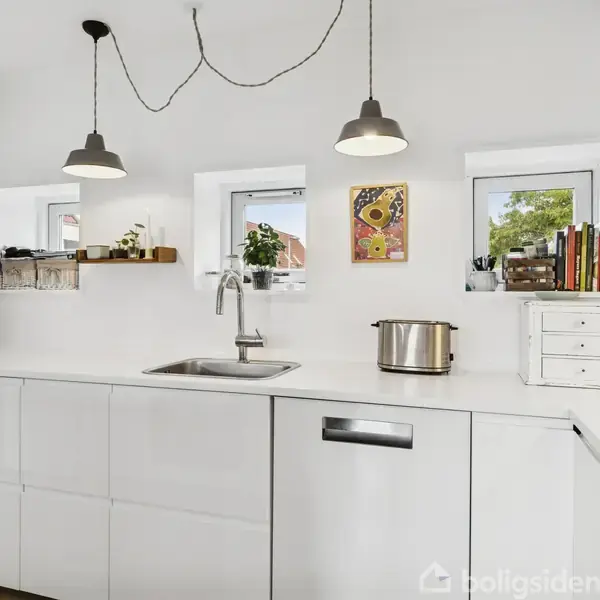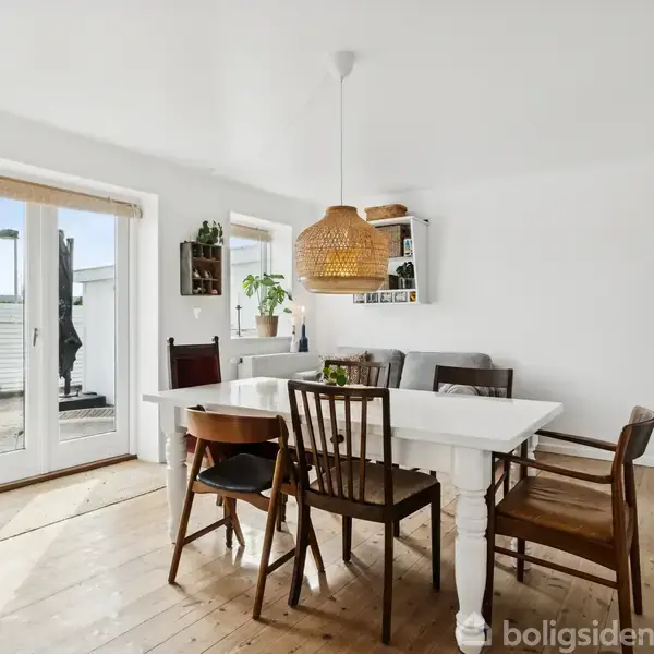 Det første, der møder dig her, er en indbydende hjemlig stemning med lyst træ i gulvene, hvide vægge og masser af vinduer, der lader lyset strømme ind. Dobbelthuset på 113 m² fremstår charmerende og velholdt, og allerede ved ankomsten mærker man følelsen af privatliv med hækkene og carporten ved indkørslen. Den frodige, lukkede terrasse og den solrige altan inviterer begge til udendørsliv og stille stunder med udsyn over grønne arealer. Indretningen er gennemtænkt til familieliv med i alt seks