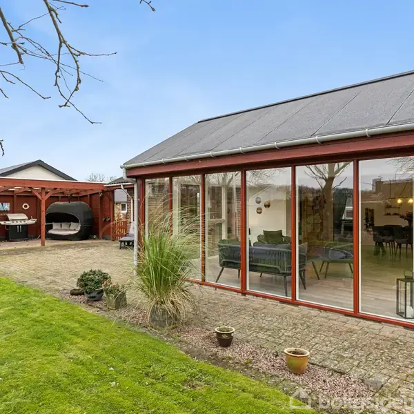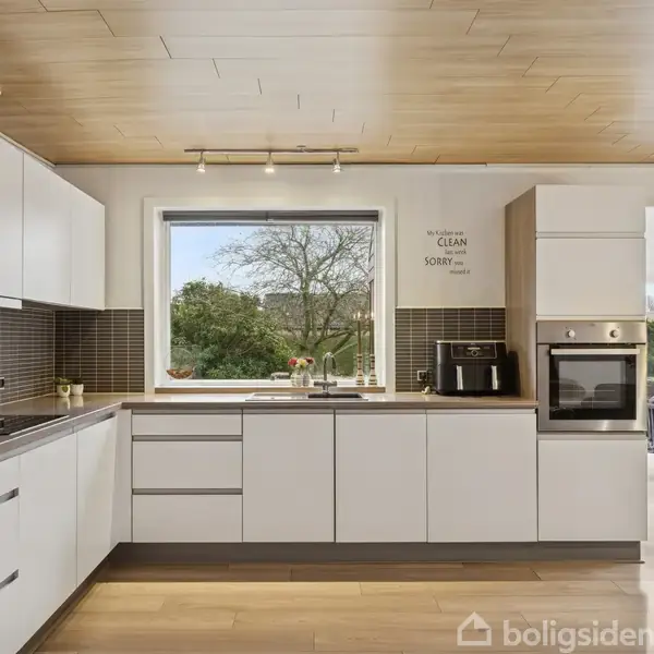 Velindrettet villa med hyggelig have  Denne villa har en dejlig indretning med to badeværelser, tre værelser, et kontor og herlige opholdsmiljøer. Der er i 2021 tilbygget en ekstra stue, hvor lyset og udsigten til haven skaber et skønt miljø. Samtidig venter et nyere køkken-alrum. Udendørs kan I se frem til en have med flere hyggelige kroge og dejlige opholdssteder. Hjemmet ligger på et lukket vænge tæt på alt det, Ringkøbing har at byde på.  I det store køkken er der plads til, at I kan lave fæ