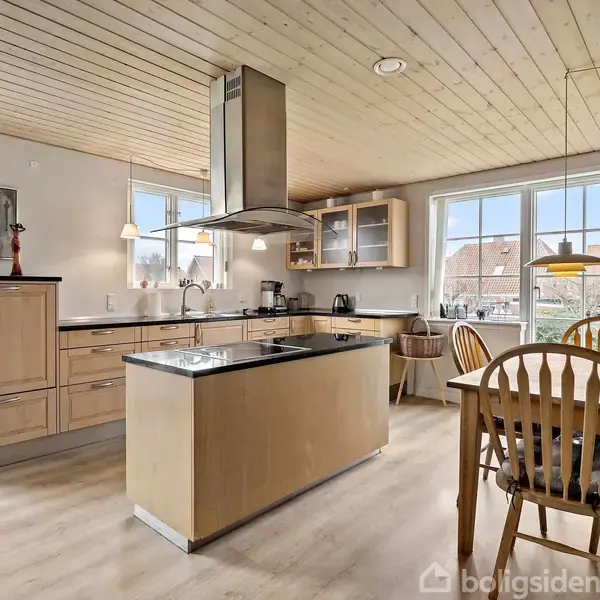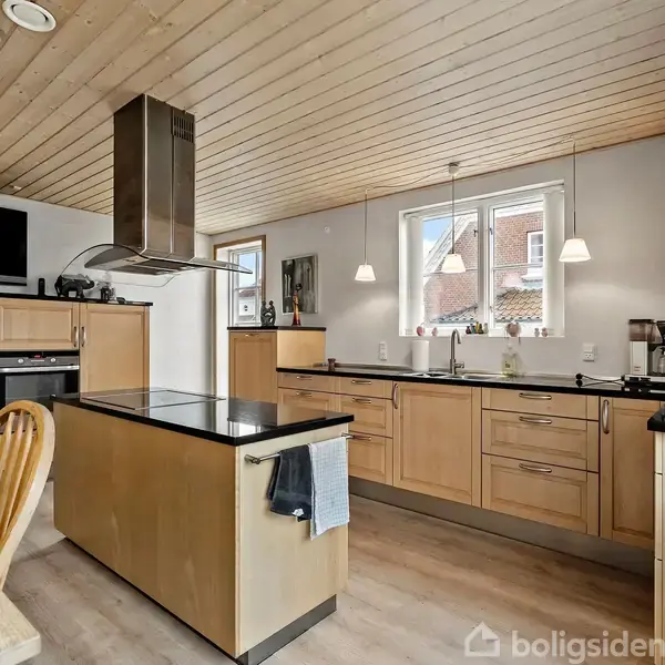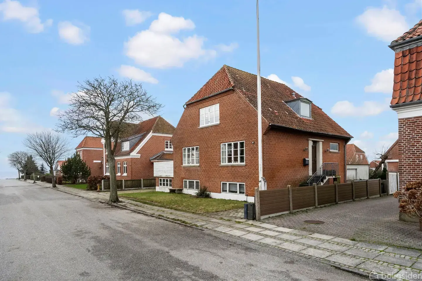 Velindrettet villa på Fjord Alle 16 - tæt på centrum På den attraktive og bynære Fjord Alle finder du denne rummelige villa med en gennemtænkt planløsning og mange anvendelige kvadratmeter. Boligens helt centrale rum er det store køkken, hvor der er tænkt på gode arbejdsforhold til at junglere med såvel den travle hverdagsmad som weekendens gourmetretter. Her er plads til spiseafdeling og de to store terrassedøre leder lyset ind og giver samtidig adgang ud til de to store terrasser mod henholdsvis syd og vest. Den store herskabelige stue har plads til både spisebordet, hvor hele familien kan samles samt en hyggelig sofagruppe, hvor dagens indtryk kan bundfælde sig i et afslappet miljø. Førstesalen byder sig til med to store værelser, hvoraf det ene både har garderoberum samt stor skabsvæg. Det andet værelse har med sydvendt kvist en flot udsigt over Ringkøbing Fjord. På førstesalen har vi desuden et stort badeværelse. De tre disponible rum i kælderen har værelseskvalitet, og med radiator og genvex sikres gode forhold. I kælderen er desuden stort vaskerum samt mindre badeværelse. Fra Fjord Alle er der kun få hundrede meter til Ringkøbings charmerende bymidte og indbydende havnemiljø, som via de brostensbelagte gader bindes sammen med det hyggelige torv.