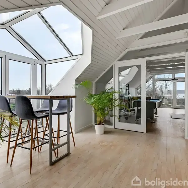 Denne rummelige villa ligger ideelt placeret på en stor grund med direkte adgang til fjorden og den naturskønne strand. Den unikke kombination af god plads, store vinduespartier med udsigt til fjorden og en markant arkitektonisk form gør huset til et hjem for dem, der ønsker både ro og udsyn i et naturskønt miljø. Hyggelige terrasser og altaner udvider boligens arealer smukt ud mod haven og vandsiden.I stueetagen ligger køkken og spisestue med brede glasmoduler, der giver rigeligt dagslys og dir