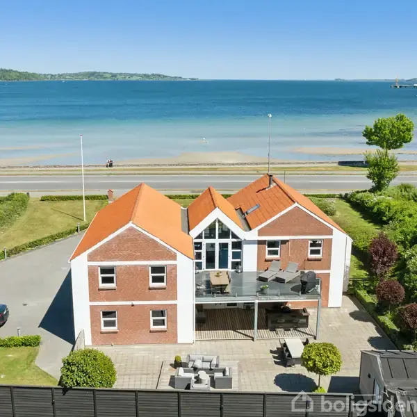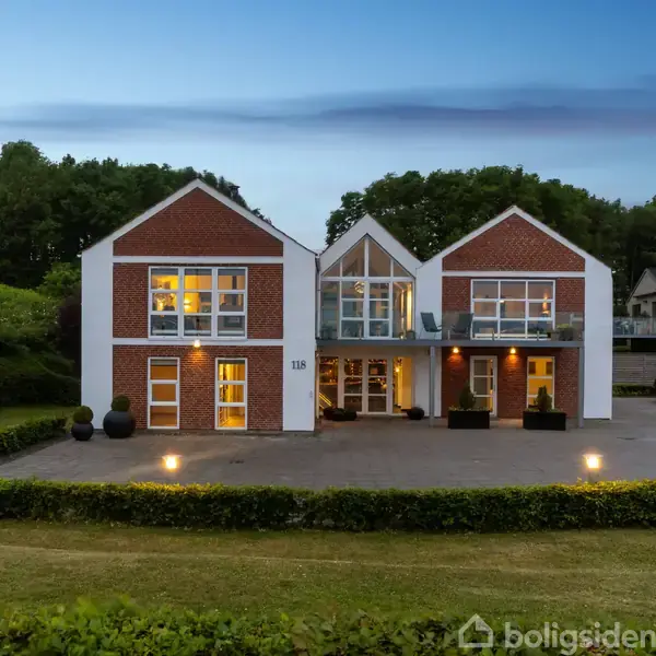 Det arkitektoniske udtryk er spændende. Hjemmet former sig nærmest som tre huse side om side, der samtidig hænger harmonisk sammen. Symmetrien er til at få øje på med de enorme glaspartier på sektionen i midten, mens de to dele i siderne matcher hinanden. Det gør det hele i øvrigt med hvide kanter, røde mursten og det matchende tag. Husets look er dog ikke det første, man bemærker, selvom det er dragende. Ejendommen er nemlig placeret i første række til Aabenraa Fjord, så øjnene vil straks vandr