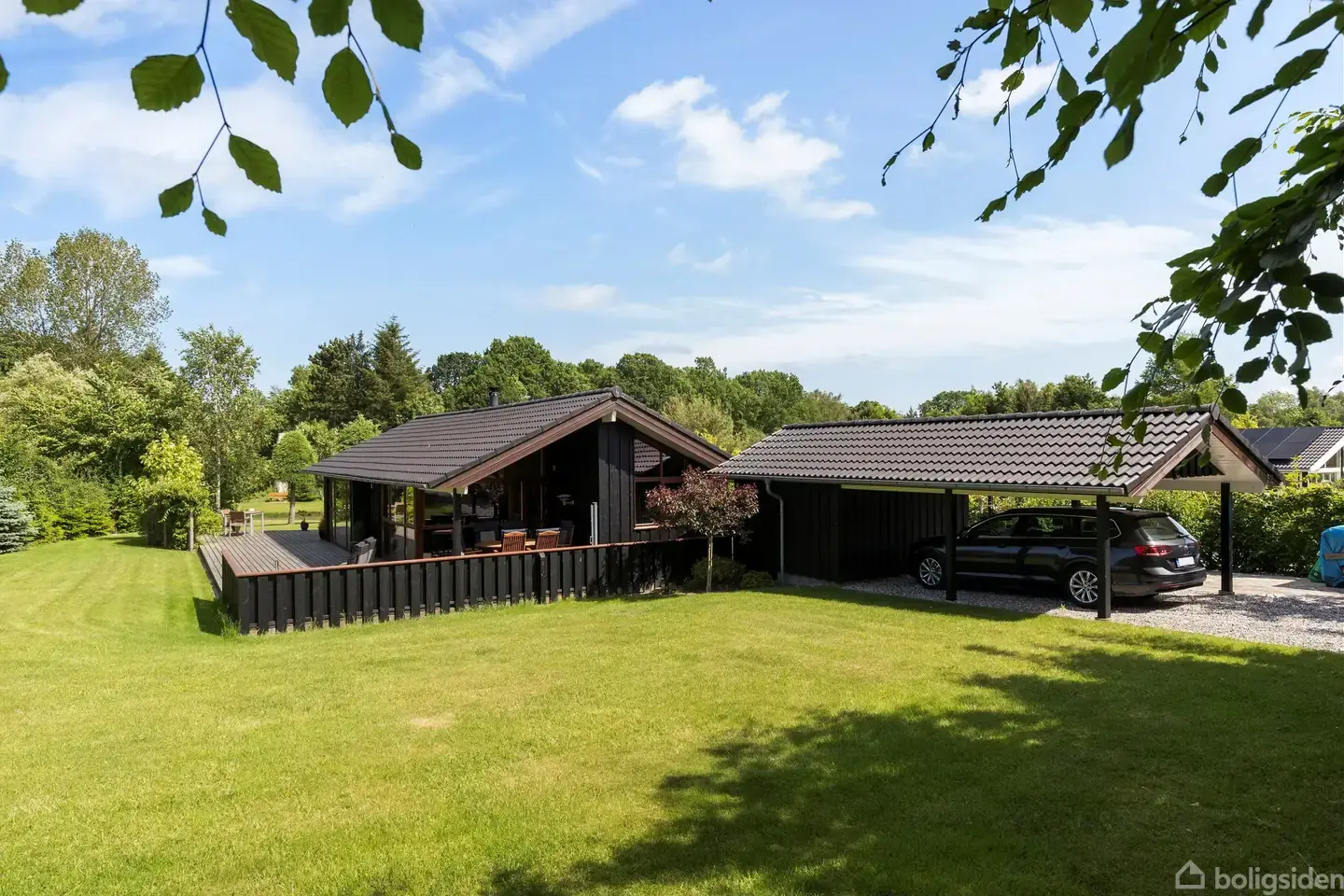Nyere kvalitetssommerhus med usædvanlig dejlig beliggenhed - smuk udsigt til sø og gåafstand til standen. Beliggende på ugeneret grund på lukket vendeplads. Et rigtig dejligt sommerhus i flotte materialer og absolut velholdt - et perfekt sted til afslapning - når man både kan nyde kvaliteten af sommerhuset og den skønne udsigt. Sommerhuset er indrettet med 3 gode værelser, "Svane" køkken i åben forbindelse med stuen, god entre med skabsplads, badeværelse med bruseniche og vaskemaskine. Lofter til kip og store vinduesarealer, som giver nogle dejligt lyse rum. Dog alm. lofter i 2 af værelserne, da der er en god stor hems over dette areal. Gulvvarme i badeværelse og entré. Store terrassearealer, heraf en del overdækket. Integreret udhus/teknikrum. Carport med isoleret redskabsrum.