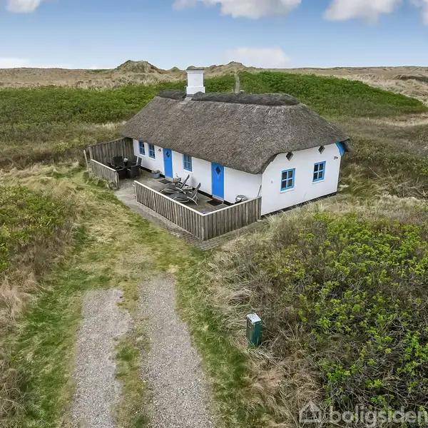 Tæt ved klitterne og det brusende Vesterhav ligger dette stemningsfulde fritidshus, som bestemt fortjener et nyt kig. Her får I et klassisk og hyggeligt sommerhus med stråtag, beliggende i et roligt hjørne af Vrist - ideelt for jer, der søger fred, ro og ægte vestkyststemning. Fra toppen af klitterne kan I nyde solnedgangen, og huset byder på en veldisponeret indretning med flere fine kvaliteter. Huset ligger på en 1.489 m² stor grund. Ved huset finder I en terrasse, hvor sommerdagene kan nydes i læ, mens klitterne og den brede sandstrand ligger få skridt væk. Ejendommen fremstår med hvidkalket facade og klassisk stråtag, smukt suppleret af blåmalede vinduesrammer og døre, der understreger den autentiske sommerhuscharme. Huset er oprindeligt opført i 1960 og blev udvidet i 1997, hvilket giver ekstra plads ud over de registrerede 56 m². Den integrerede udestue på 6 m² samt en rummelig hems bidrager med gode, anvendelige kvadratmeter. Stuen er husets naturlige samlingspunkt med loft til kip, fine trælister, alkove og brændeovn, der skaber den helt rette feriestemning. Udestuen sikrer et skønt lysindfald, og både stue og det ene soveværelse har udgang til terrassen. Køkkenet ligger i åben forbindelse med opholdsrummet, og boligen rummer desuden et badeværelse med lyse fliser. Området mellem Vejlby og Vrist er et populært sommerhusområde med enestående natur og gode muligheder for friluftsliv. Her er brede, børnevenlige strande, smukke klitlandskaber og et aktivt lokalmiljø. En tur til Thyborøn byder på oplevelser som JyllandsAkvariet og Sea War Museum Jutland, mens Lemvig lokker med handel, havnemiljø og kulturliv. I nærliggende Harboøre findes dagligvareindkøb og lokale arrangementer. Kontakt os for en fremvisning på 96 63 40 00 - vi glæder os til at vise jer huset igen.