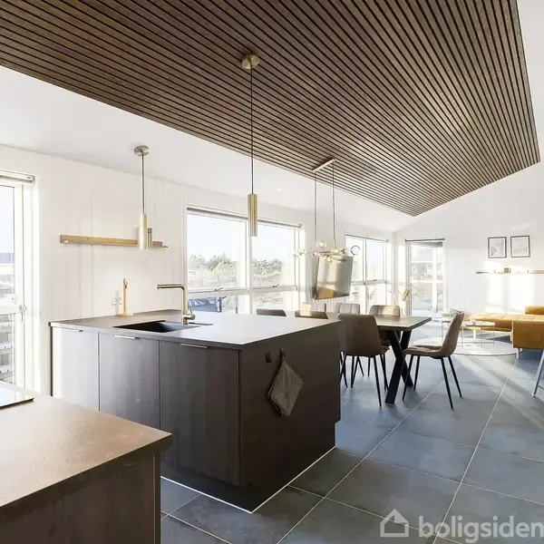 Nu udbydes dette topmoderne fritidshus fra 2023, smukt beliggende mellem hav og fjord i attraktive Søndervig.Beliggenheden er ideel – for enden af en lukket sidevej, hvor roen er i fokus, og samtidig med kun ca. 1. km. til det imponerende Vesterhav med brede sandstrande og brusende bølger. Her er desuden gåafstand til Søndervig centrum med indkøb, restauranter, badeland, minigolf, tennisbaner og øvrige ferieaktiviteter.Ejendommen er opført på en lyngklædt og let kuperet naturgrund på hele 2.473