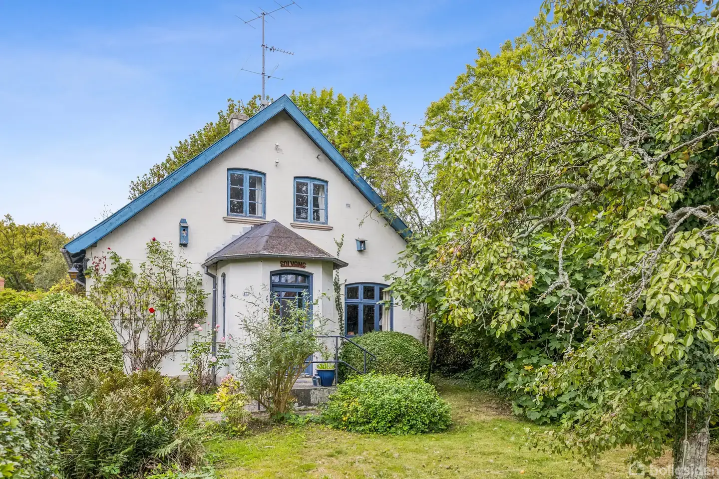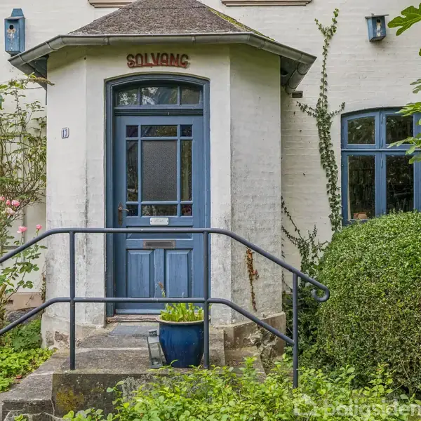 Lige op ad kirken finder man denne klassiske villa fra 1907, som rummer masser af charme og originale detaljer – og samtidig et stort potentiale for den, der ønsker at sætte sit eget præg. Huset ligger godt tilbagetrukket fra vejen på en grund på 668 m2. Det præsenterer sig med hvid facade, mens udhæng, vinduer og døre er malet himmelblå. Huset bærer navnet Solvang, som står skrevet over det lille indgangsparti foran entréen. Huset har bevaret mange af de originale detaljer, der er med til at