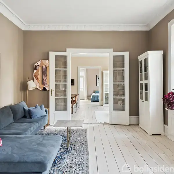 Det er de færreste, der får mulighed for at bo som her – i en storslået seksværelses lejlighed midt i hjertet af Charlottenlund, hvor historiens vingesus møder moderne komfort. Lejligheden folder sig ud med fire imponerende stuer en suite, alle vendt mod vest, badet i eftermiddagens gyldne sollys og prydet med mere end tre meter til loftet og unikke stuklofter, hver med sit eget raffinerede udtryk. De to hjørnestuer kan let fungere som separate værelser uden gennemgang, hvilket giver en sjælden