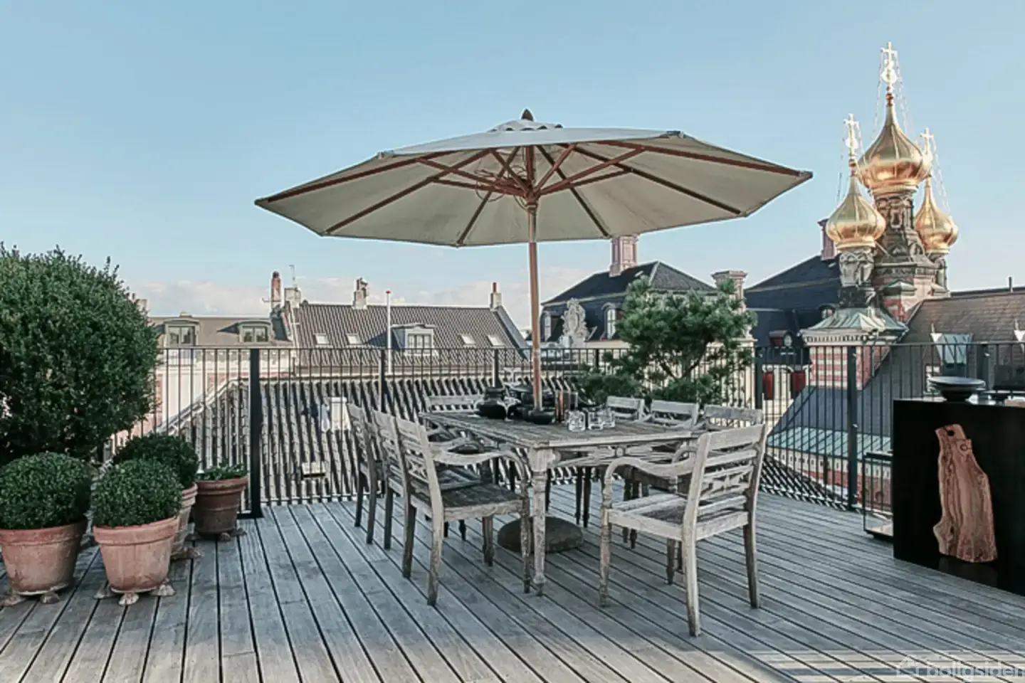 Frederiksstadens største og smukkeste tagterrasse udbydes nu til salg Denne unikke lejlighed i Frederiksstaden er et moderne mesterværk beliggende i en smukt designet ejendom. Med 105 kvadratmeter tilbyder lejligheden rigelig plads til at skabe et komfortabelt hjem. Lejlighedens mest imponerende træk er den private tagterrasse på 120 kvadratmeter. Tagterrassen tilbyder en fantastisk udsigt over København og skaber et ideelt sted til udendørs aktiviteter eller bare afslapning. For nem adgang er d