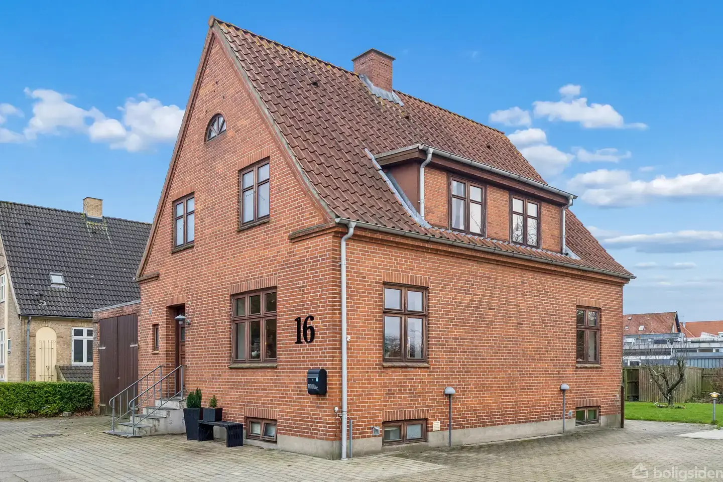 Murermestervilla centralt i Hjørring Det er det klassiske, smukke udtryk, der møder jer med de røde mursten, den murede gesims, sprossevinduerne og det nyere tag. Jeres kommende hjem er nemlig en murermestervilla, der samtidig ligger helt centralt i Hjørring, tæt på både byen og naturområder.Boligen er løbende vedligeholdt, og det startede i 2022, hvor bryggerset blev renoveret, der blev lavet adgang mellem hus og garage, og køkken, stue og entré fik skiftet gulve. I 2023 kom turen til gulvene i