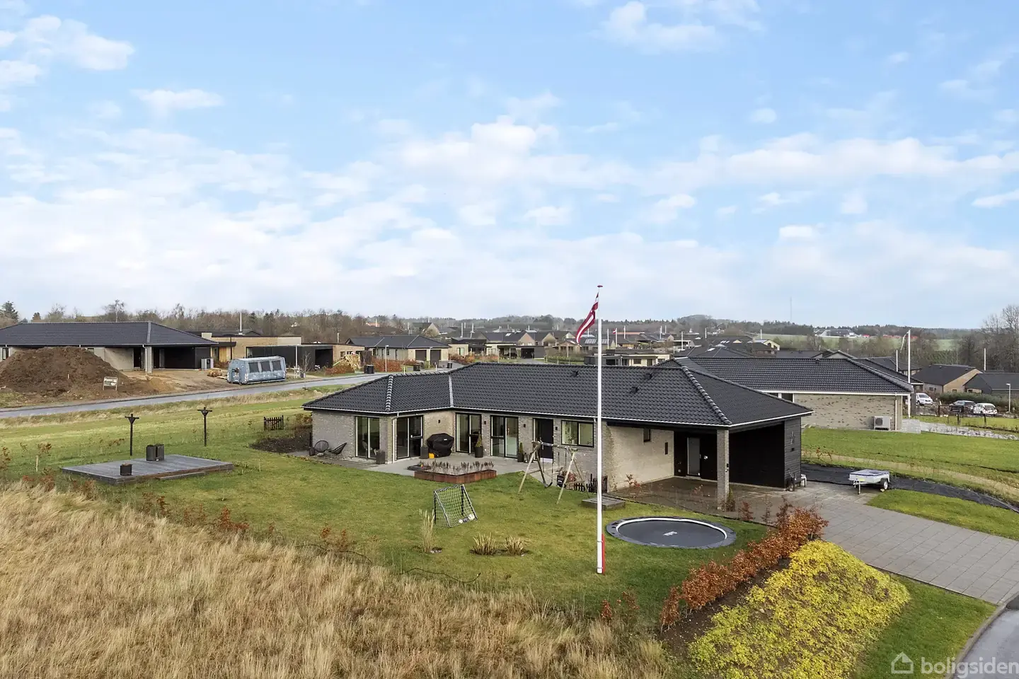 Frisholmparken 144 er en nyere familievilla fra 2022, som er smukt placeret højt i udstykningen med en rummelig have og kig til skoven. Indenfor venter en gennemtænkt planløsning med fire værelser, to badeværelser samt køkken/alrum og stue i åben forbindelse, mens en vestvendt terrasse, legefaciliteter og integreret carport fuldender helheden.Frisholmparken er en nyere udstykning i populære Them, og her venter en etplansvilla, der er børnefamiliens perfekte afslutning på boligsøgningen. De grå m
