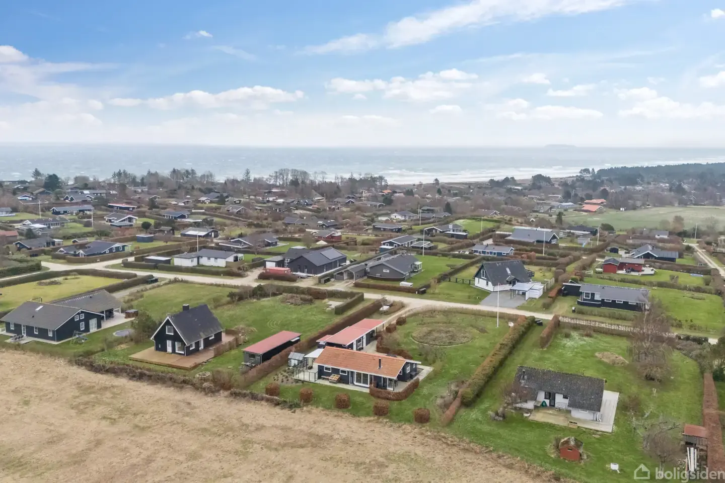 Hyggeligt fritidshus med udsigt til marker og Dråby StrandVed Dråby Strand, i det særdeles populære sommerhusområde, finder man dette sortmalede træhus ideelt placeret med fri udsigt over de åbne marker og Dråby Strand. Huset er beliggende på en stor grund, der støder direkte op til de åbne marker, og er anlagt med dekorative bede og prydbuske samt indrammet af hæk, som sikrer mere private omgivelser. Hele vejen rundt om huset er der anlagt træterrasse, hvilket giver mulighed for at følge solen