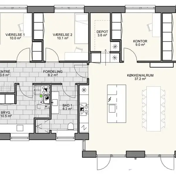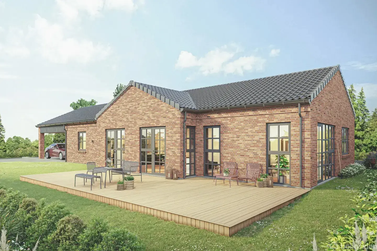 Længehus Signatur 165 er tegnet med fokus på at skabe et hjem, hvor de klassiske linjer får selskab af moderne, gennemtænkte detaljer. Formen er enkel og rolig, men får et unikt udtryk takket være den smukke vinkel midt på huset — en arkitektonisk finesse, der både kan ses og mærkes i hverdagen. Her får du et længehus, der skiller sig ud, uden at råbe højt.Den elegante vinkel i facaden giver huset en særskilt karakter og skaber en flot bevægelse i taglinjen. Sammen med de røde mursten, de sorte
