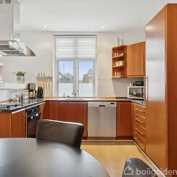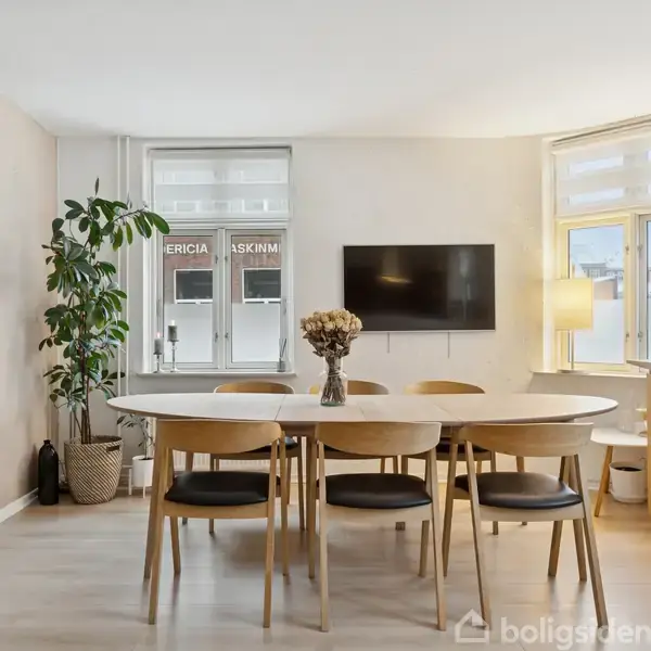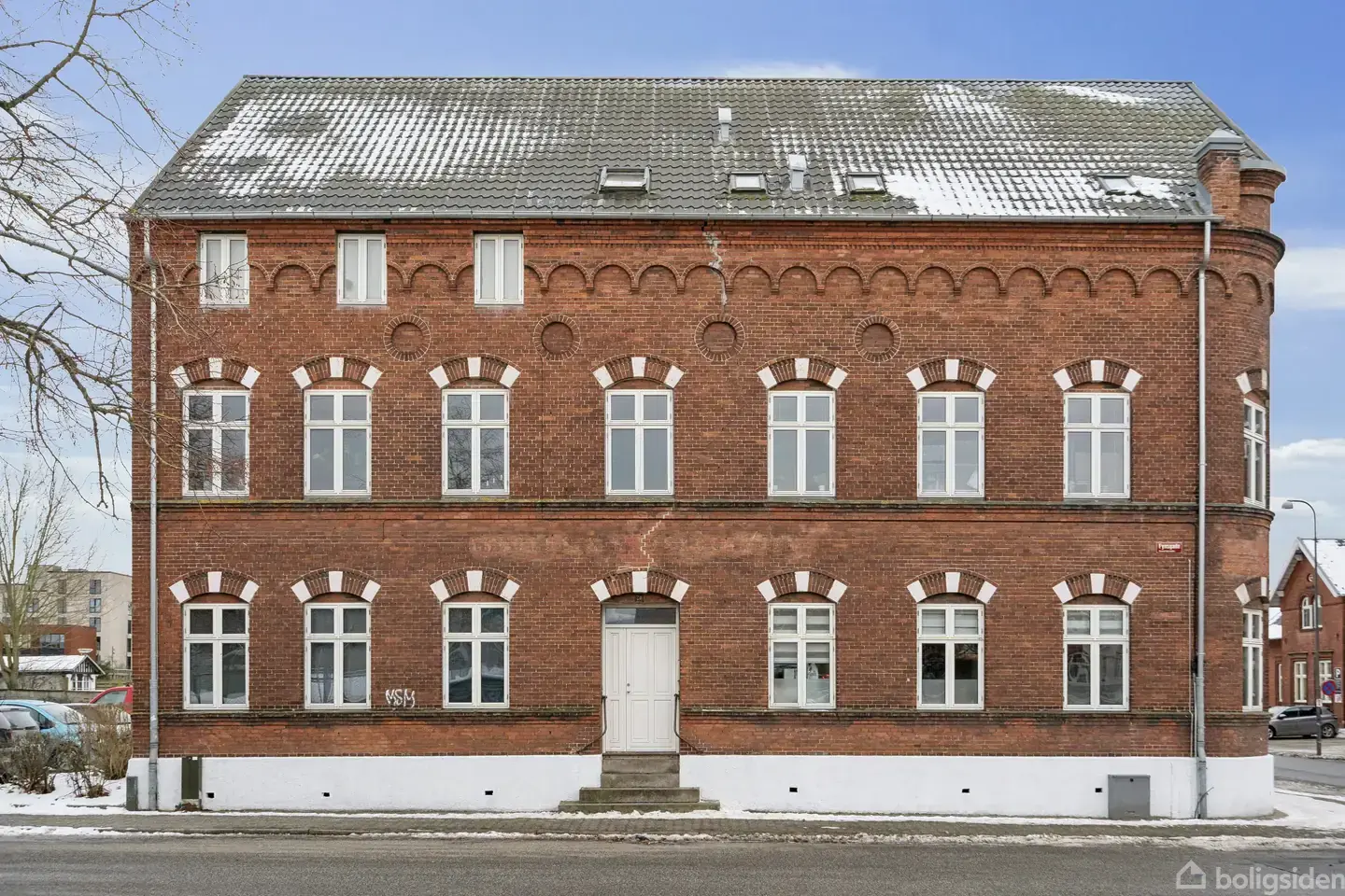 Denne imponerende ejerlejlighed på Fynsgade 26 kombinerer historisk charme med en yderst rummelig og moderne planløsning. Boligen præsenterer sig med en smuk, klassisk røde murstensfacade prydet med dekorative detaljer og hvide sprossevinduer, der vidner om en ejendom med sjæl og solidt håndværk.Indenfor mødes man af en lys entré, der fungerer som boligens fordelingspunkt med adgang til et praktisk bryggers med vaskefaciliteter samt et moderne badeværelse. Boligens naturlige samlingspunkt er det