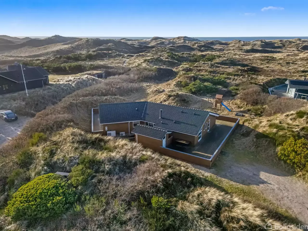 Nogle steder taler for sig selv – og dette er ét af dem. For enden af en blind vej, på en pragtfuld og børnevenlig naturgrund, der strækker sig helt ud til Vesterhavet, ligger dette unikke sommerhus, diskret gemt i det rå, vestjyske landskab. Klitterne fletter sig naturligt sammen med grunden og skaber en unik harmoni mellem sommerhuset og naturen. Her er du ikke bare tæt på havet – du er en del af det. Fra huset er der knap 6 minutters gang ad stier gennem det smukke klitlandskab, før du står m