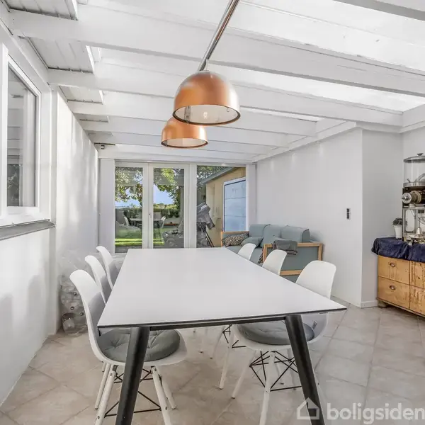 Velholdt og velindrettede villa, hvor hverdagsindgang åbner til et lyst opholdsområde i åben forbindelse med køkkenet. Køkkenet har god skabsplads og et naturligt samlingspunkt til hverdagens måltider. Den rummelige stue byder på et dejligt lysindfald fra de sydvendte vinduer og har pilleovn, der giver både varme og atmosfære. Fra stuen er der adgang til husets værelsesafdeling med to gode værelser og et pænt badeværelse med bruseniche. Villaen rummer desuden praktiske disponible rum, ideelle so