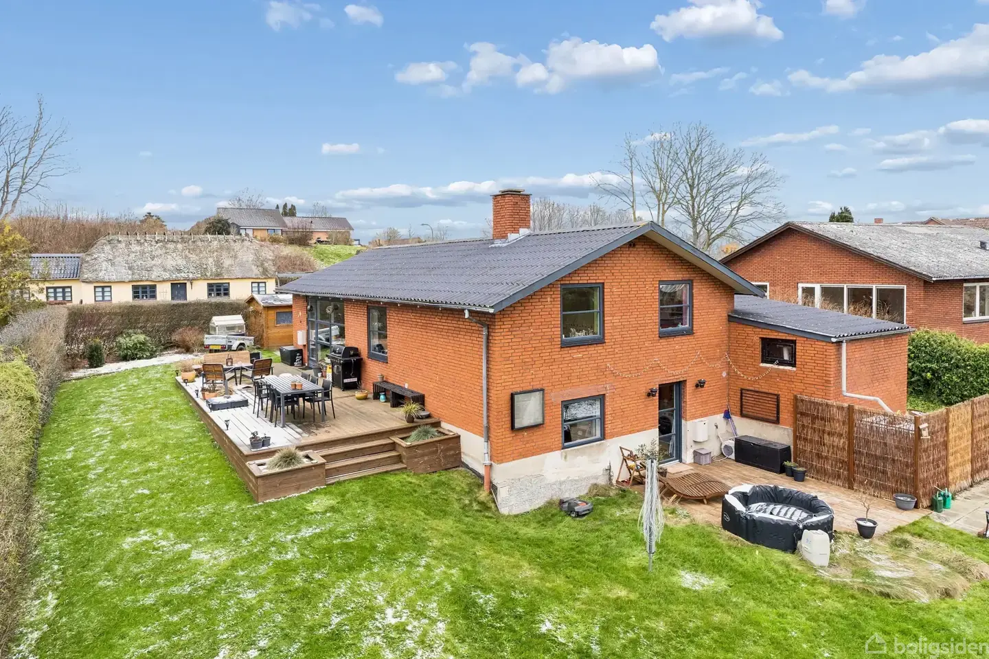 Solid rødstensvilla med istandsat kælder Familien på jagt efter en tryg base kan se sig godt hjemme her i Gårslev. I den rolige by, udbyder vi nemlig en velindrettet og velholdt villa, der er løbende istandsat og tilpasset familielivet. Senest blev kælderen i 2024 fuldstændig istandsat med gulvvarme overalt og et lækkert sekundært badeværelse, der supplerer værelsesafdelingen ovenpå, og dermed er huset tilpasset både jer med små og store børn.I stueplan samles en god andel af hjemmets kvadratmet