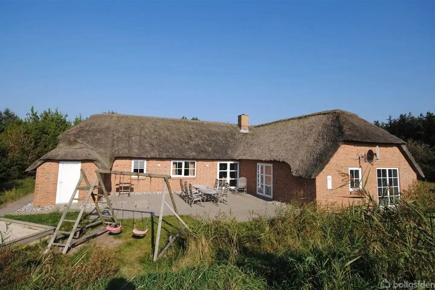 Midt i den fredelige og naturrige Husby Klitplantage finder du dette stemningsfulde og rummelige sommerhus, opført i klassiske rødbrune sten og med charmerende stråtag. Huset ligger på en stor, ugeneret naturgrund på hele 6.240 m², omkranset af træer og højt græs, hvilket skaber en rolig og privat atmosfære, hvor fuglefløjt og vinden i trætoppene udgør den naturlige baggrundsmusik. Her bor man i hjertet af et af Vestjyllands smukkeste og mest varierede naturområder – med både hede, klitter og hav inden for kort afstand. Sommerhuset rummer 193 veldisponerede kvadratmeter og byder på plads, komfort og en afslappet feriestemning året rundt. Det store, åbne opholdsrum er indrettet med køkken, spiseafdeling og stue i ét, og her er der højt til loftet – både fysisk og mentalt. Brændeovnen spreder hygge på kølige aftener, og de store vinduer trækker det naturlige lys og udsigten til det grønne indenfor. Køkkenet er veludstyret og fungerer som samlingspunkt i det daglige, mens et praktisk grovkøkken med vaskemaskine og tørretumbler gør ferielivet ekstra bekvemt. Huset har hele seks soveværelser med i alt fjorten sovepladser, fordelt med omtanke for både privatliv og fælles samvær. To lækre badeværelser – det ene i forbindelse med wellnessområdet – gør det let at være mange under samme tag. Den store pool-afdeling er et sandt trækplaster og indrettet til glæde for både børn og voksne. Her er en stor swimmingpool med modstrømsanlæg, en børnepool, et spabad til to personer og direkte adgang til husets sauna. Et sted til afslapning, leg og velvære, uanset vejret udenfor. Udenfor indbyder terrassen til lange solrige dage og hyggelige grillmiddage, mens børnene kan boltre sig på legepladsen med gynger og sandkasse. Grunden er naturligt kuperet og ugenert – en sand oase for naturelskere og dem, der søger ro fra hverdagens tempo. Husby Klitplantage er udpeget som en del af en ny naturnationalpark, hvilket betyder, at området også i fremtiden vil forblive uspoleret og fyldt med autentisk natur. Samtidig er der ikke langt til hverken indkøbsmuligheder eller byliv i Ulfborg og Holstebro, så du får det bedste fra to verdener. Dette sommerhus er ikke kun et fantastisk tilflugtssted for dig og din familie – det rummer også et betydeligt udlejningspotentiale med sin eftertragtede beliggenhed og attraktive faciliteter. Sommerhuset er i dag udlejet gennem Sol&Strand. Her får du ikke bare mursten og kvadratmeter, men et fristed med højt til himlen, bølgende klitter og Vesterhavets brusen tæt på.